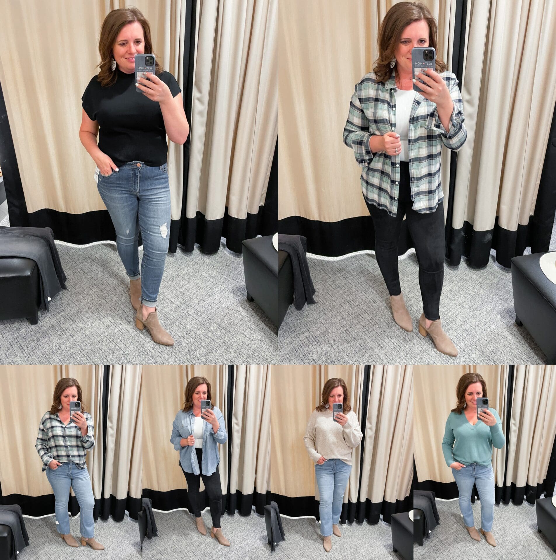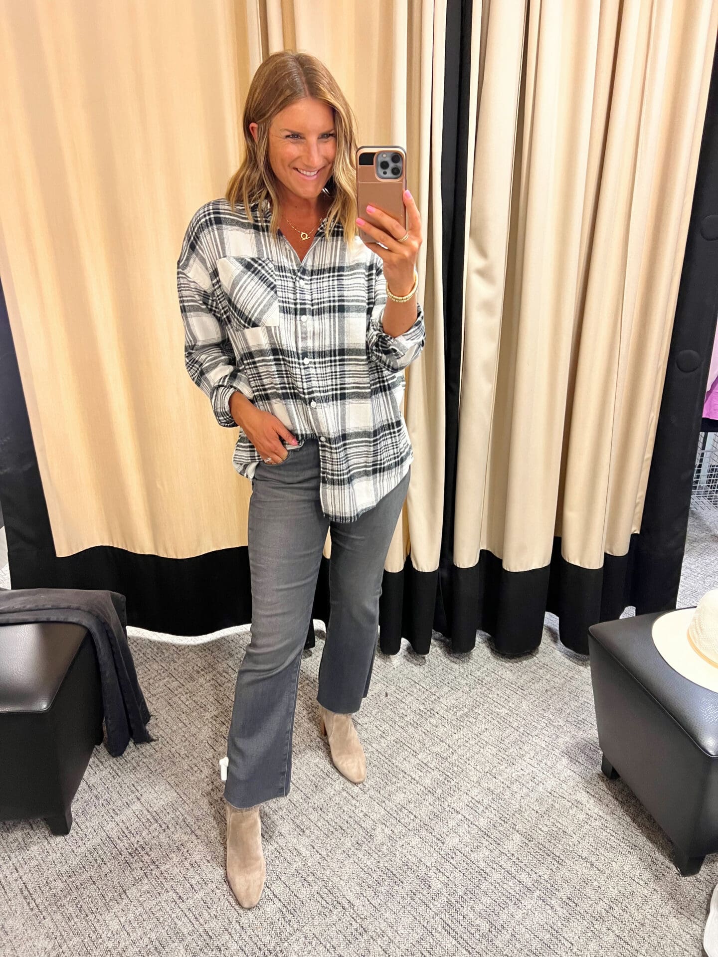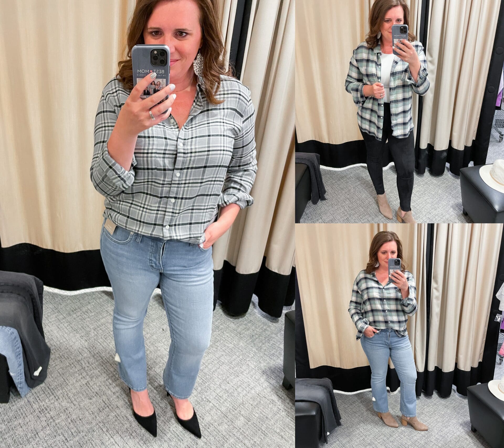 Treasure & Bond Plaid Boyfriend Shirt [Size down if between, wearing in M in Ivory Multi Fiona Plaid and Grey- Black Avery Plaid] // Madewell Kick Out Crop Mid Rise Jeans [Size down, wearing in 28] // Spanx High Waist Faux Suede Leggings [Size up if between, wearing in L] // Sam Edelman Viv Pointed Toe d’Orsay Pump [TTS, wearing in Black] // Steve Madden Havannah Pointed Toe Bootie [TTS, wearing in Mushroom]