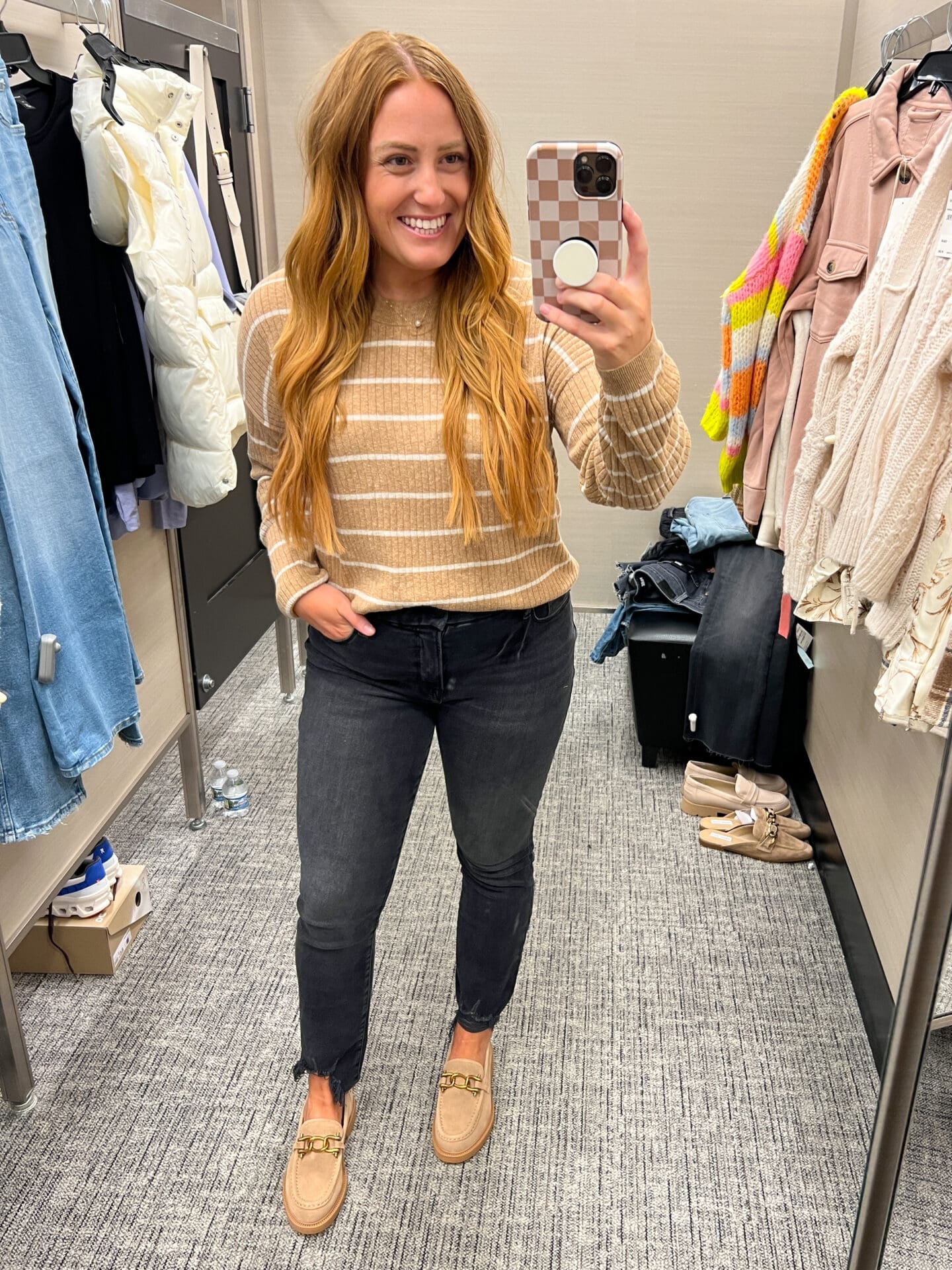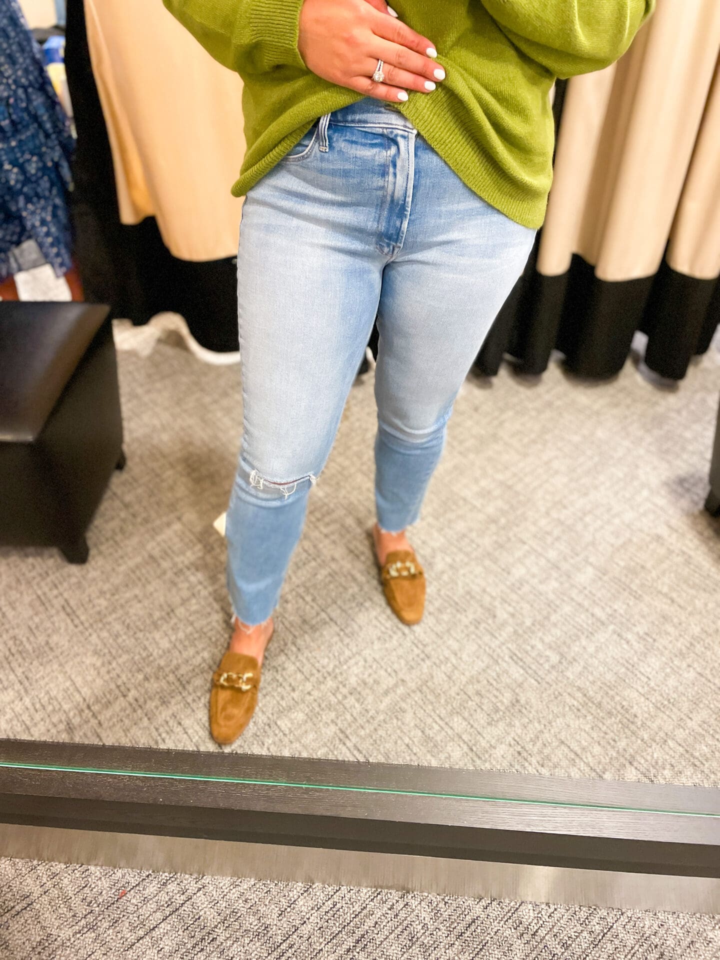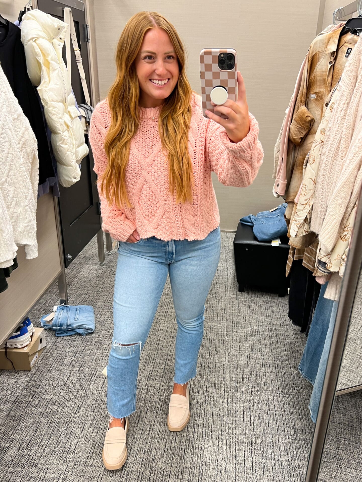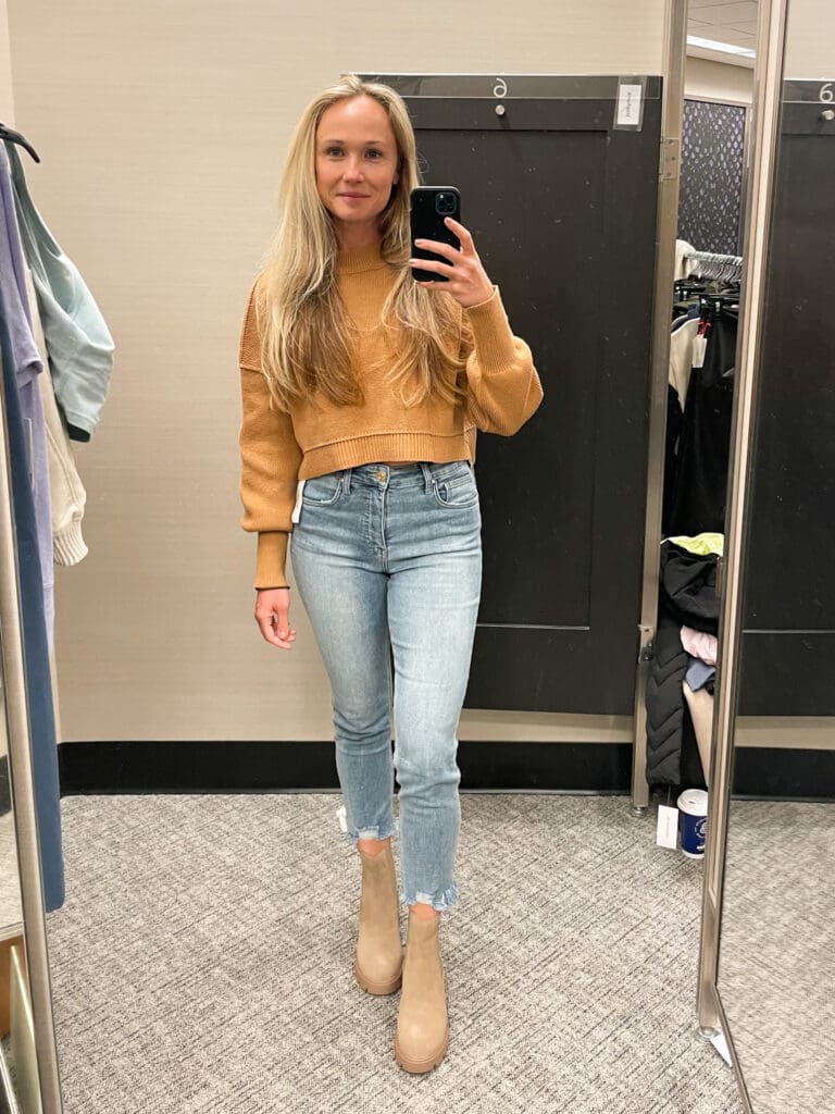Free People Sweater [cropped, I sized up to a L for a longer fit!] / Mother Denim [size down if in between, lots of stretch!] / Dolce Vita Loafers [TTS]
