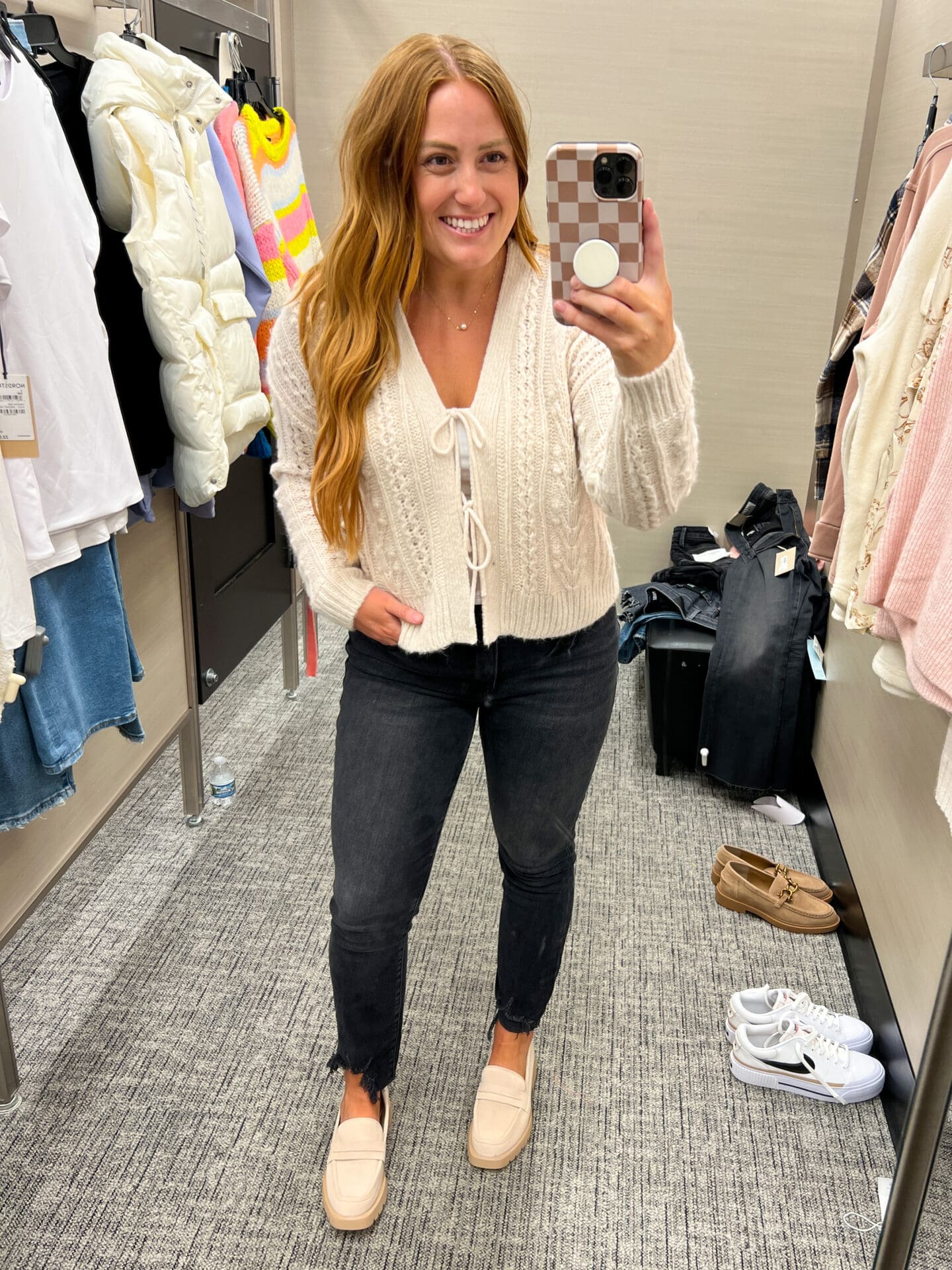Madewell Tie Front Sweater [TTS, wearing Medium] / Layering Cami / Good American Denim [size down if in between] / Dolce Vita Loafers [TTS]
