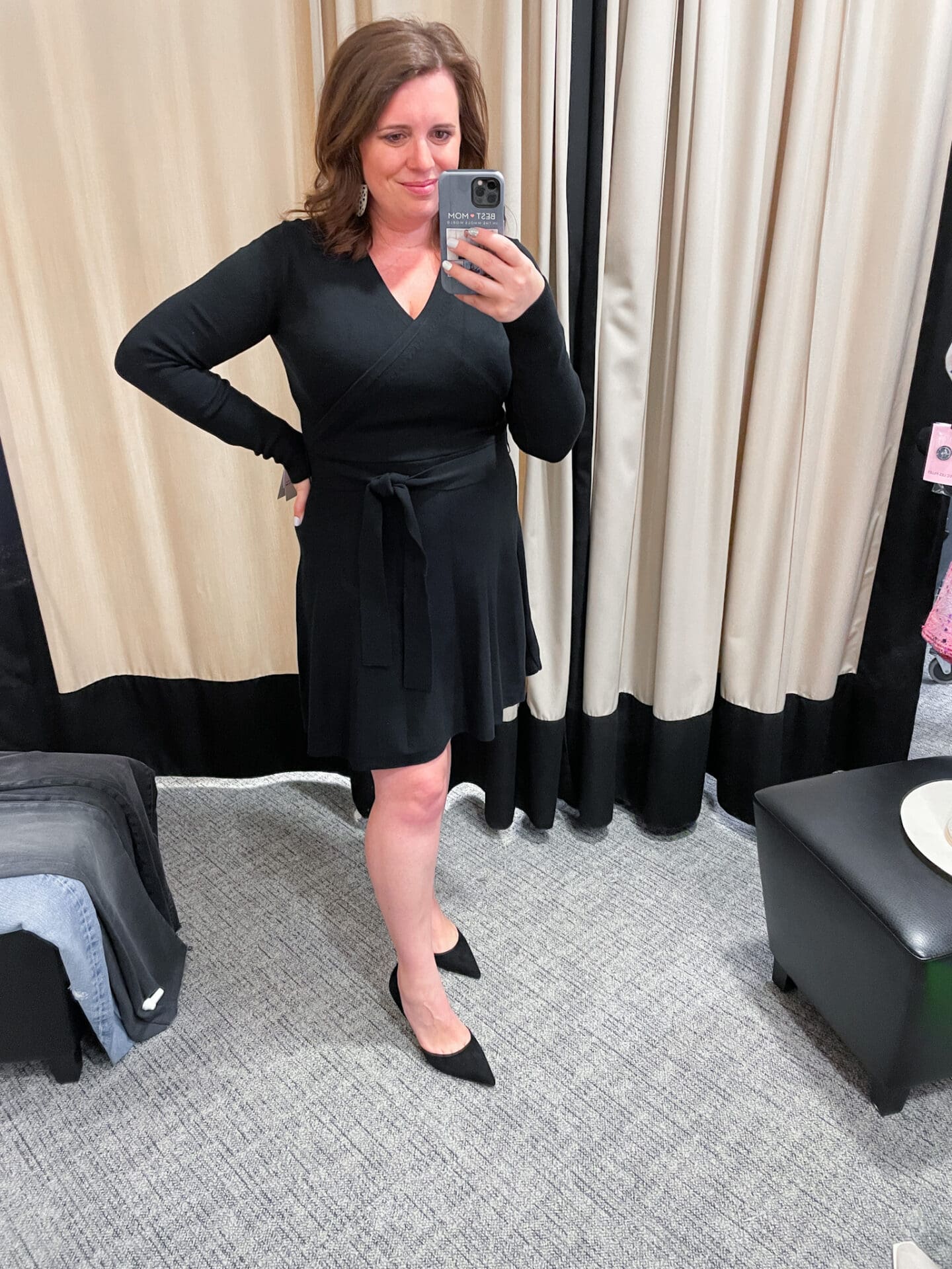 French Connection Long Sleeve Faux Wrap Sweater Dress [TTS, wearing in M in Black – anxiously awaiting for it to arrive in Deep Teal!] // Sam Edelman Viv Pointed Toe d’Orsay Pump [TTS]