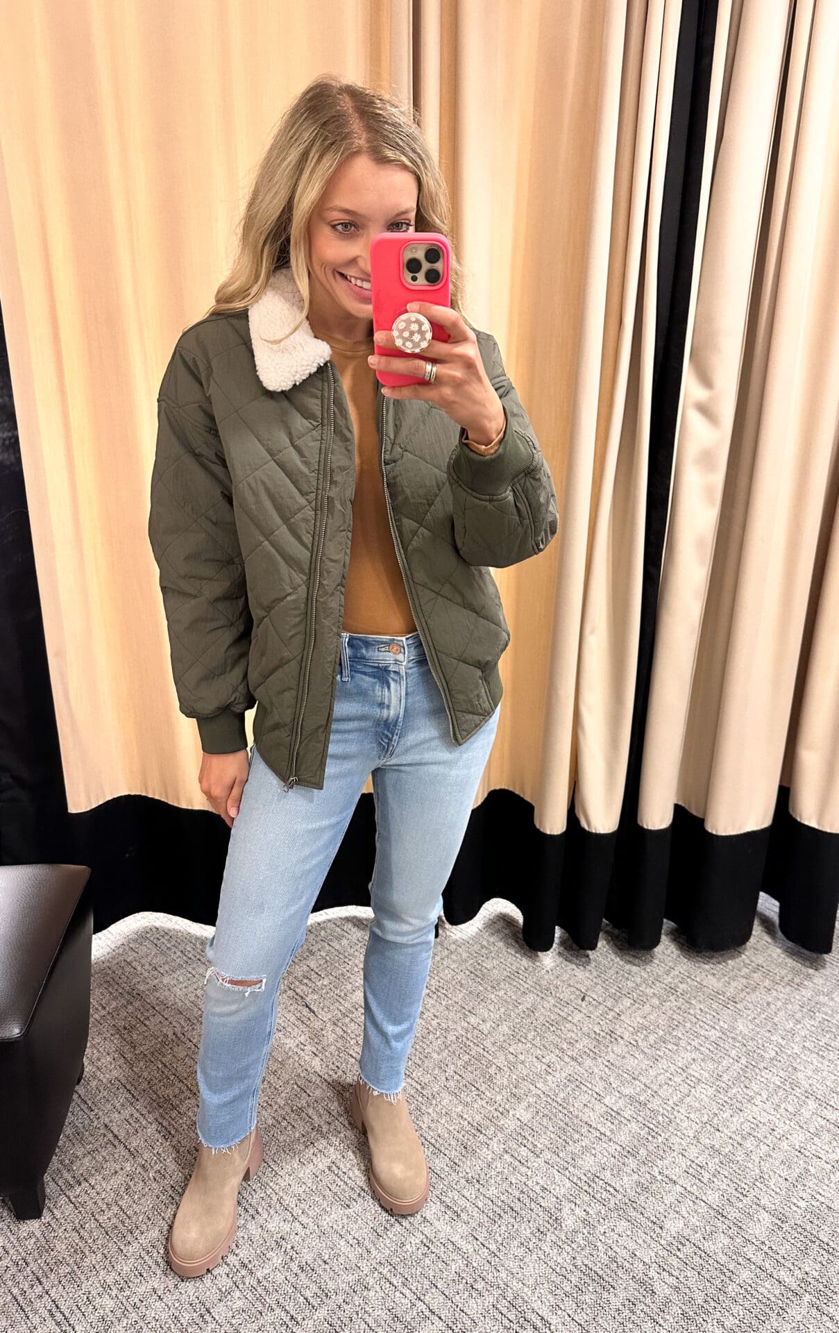 Thread & Supply Dad Jacket [true to size, wearing XS] // Halogen Crewneck T-Shirt [true to size, wearing XS] // Mother Ripped Mid Rise Slim Jeans [size down if in between, wearing 26 could do 25] // Steve Madden Haylan Chelsea Boot [true to size, wearing 8]