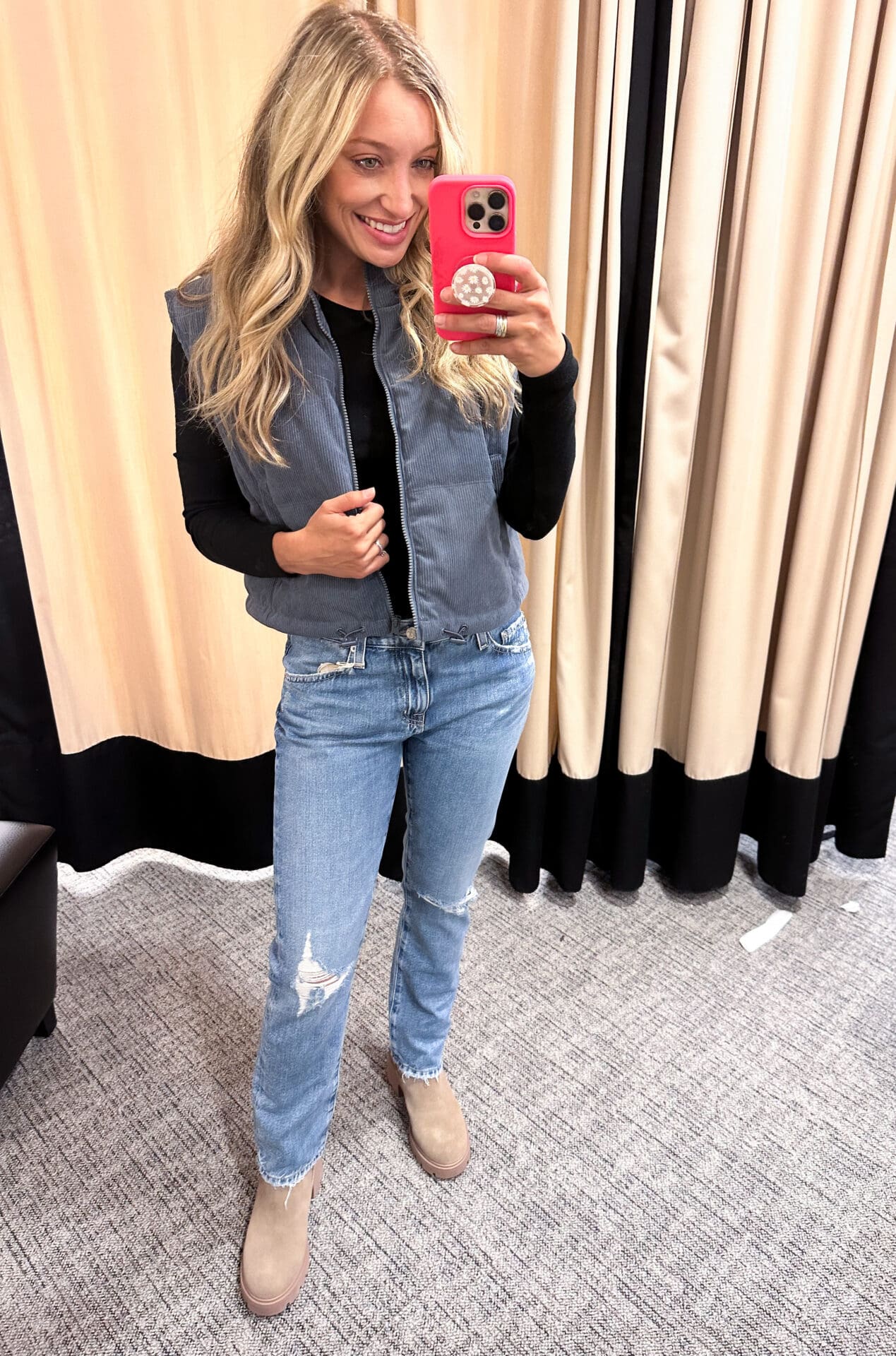 Thread & Supply Crop Corduroy Vest [size up if in between, wearing Small] // AG Ex-Boyfriend Ripped Jeans [size down, bought size 25] // Nordstrom Signature Long Sleeve Tee [size down, wearing XS] // Steve Madden Haylan Chelsea Boot [true to size, wearing 8]