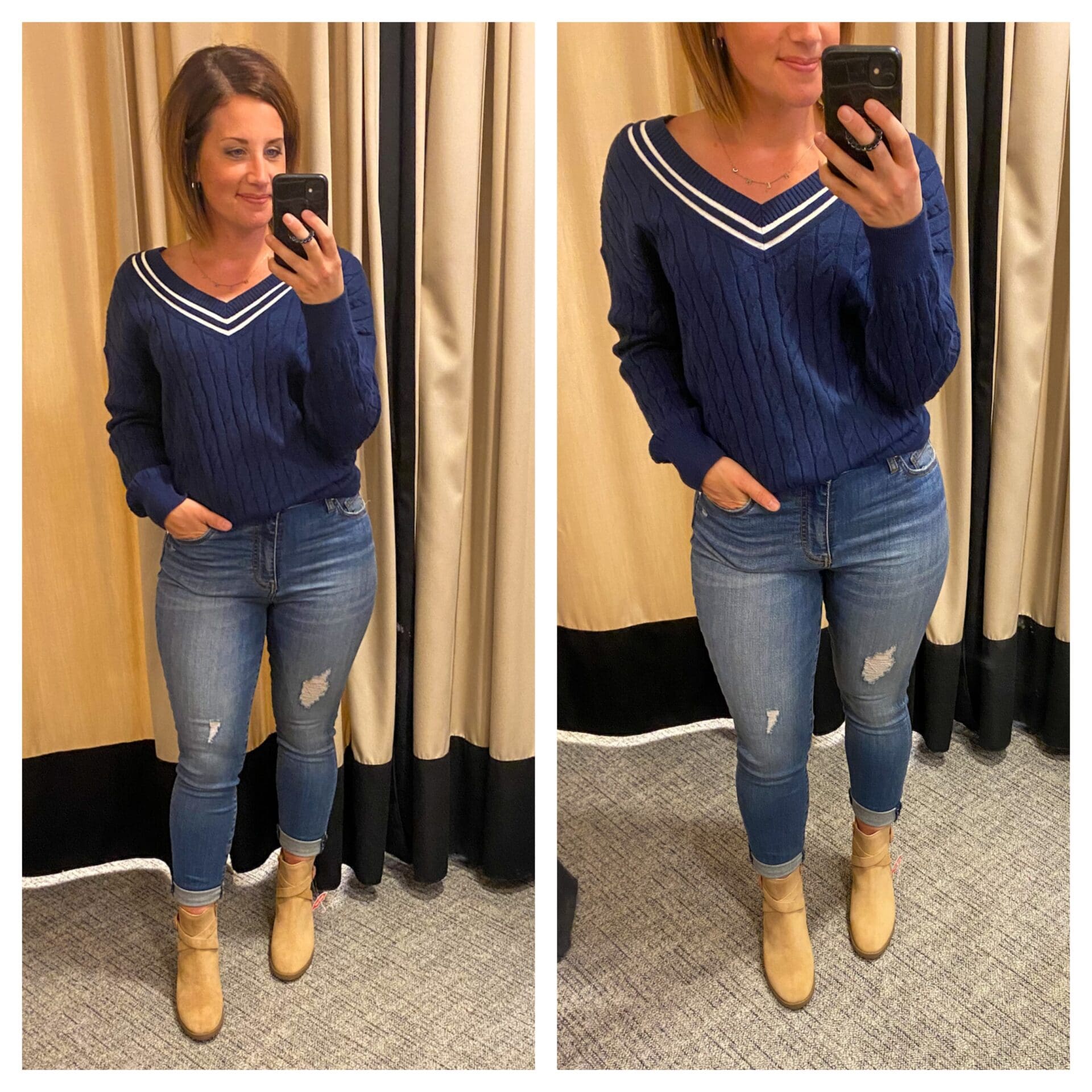 Treasure & Bond Varsity Sweater [Size down one, wearing in XS but need an XXS] // Kut from the Kloth Jeans [Size down if in between] // Blondo Booties [Size down .5]