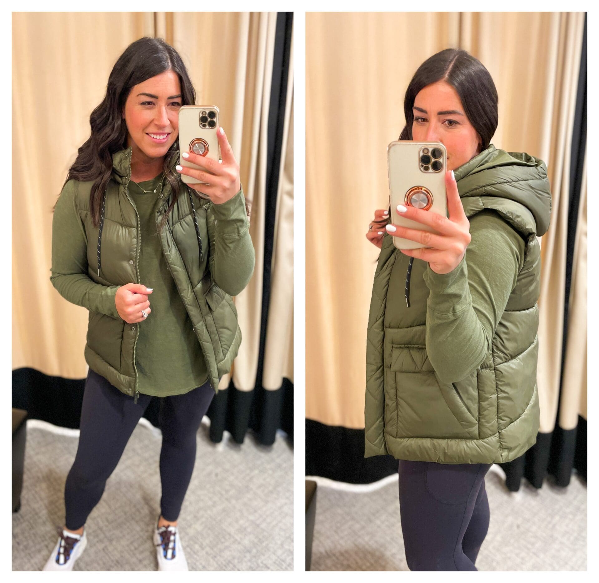 Zella Quilted Hooded Cocoon Vest [TTS, or size up if you want to zip with a large chest!] // Zella Relaxed Long Sleeve Slub Jersey T-Shirt [size down if in between, wearing in medium] // Zella Studio Luxe High Waist Pocket [true to size]