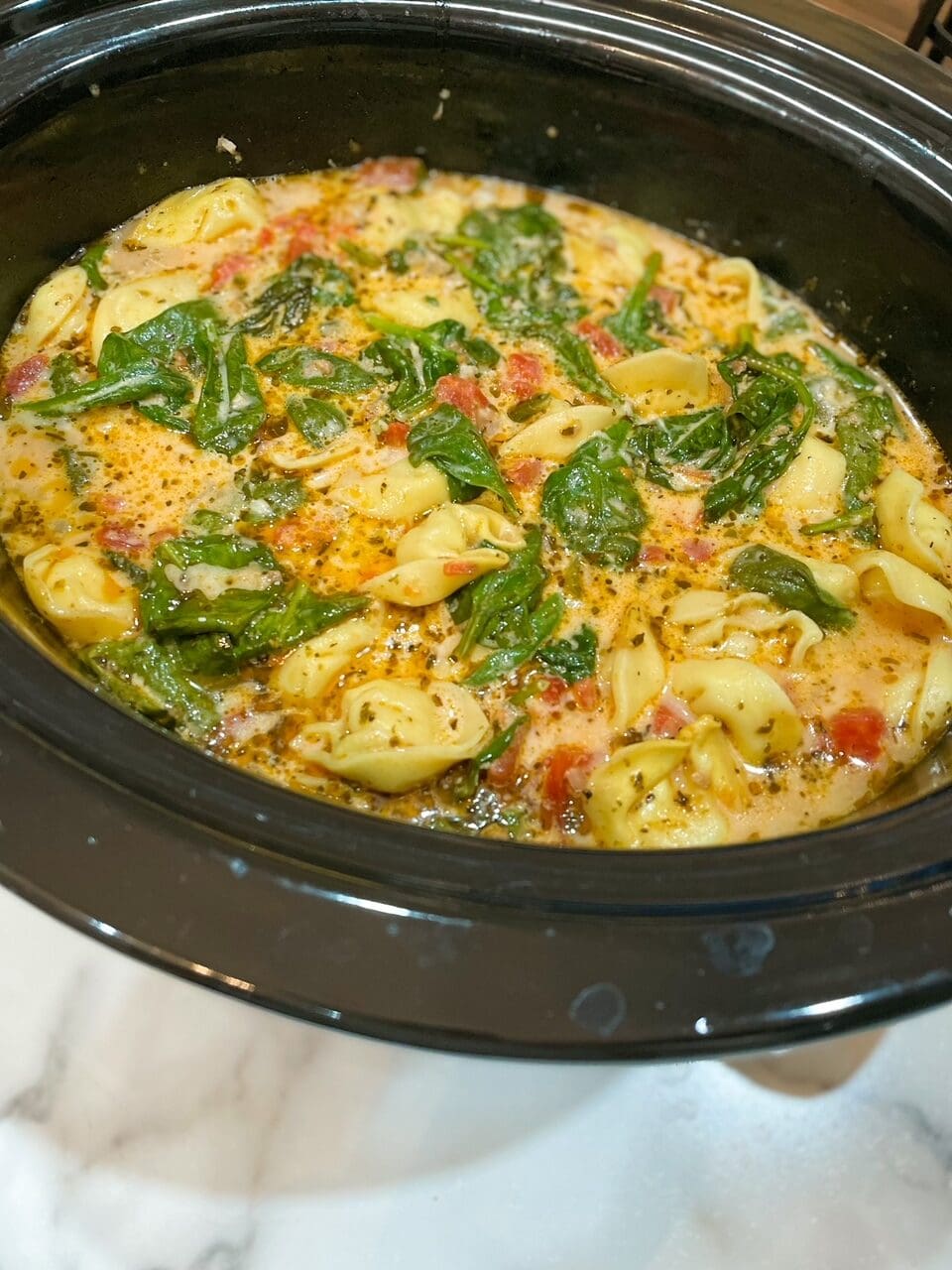 30 minutes before the cooking time is done, add the tortellini, parmesan cheese, fresh spinach and heavy cream.