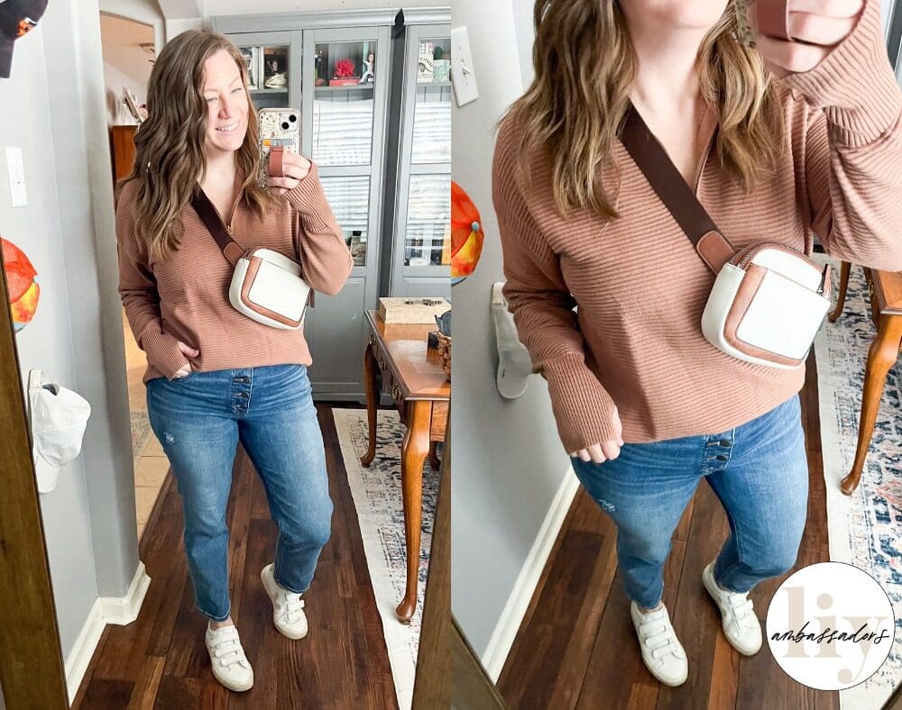 Why does a belt bag automatically make everything look cuter? Hey LIY Fam – Skye here! This post isn’t really about the belt bag, but the top! I am loving the zippered henley style and of course the thumb holes make it feel super cozy too! I find it to be true to size, wearing in a L!