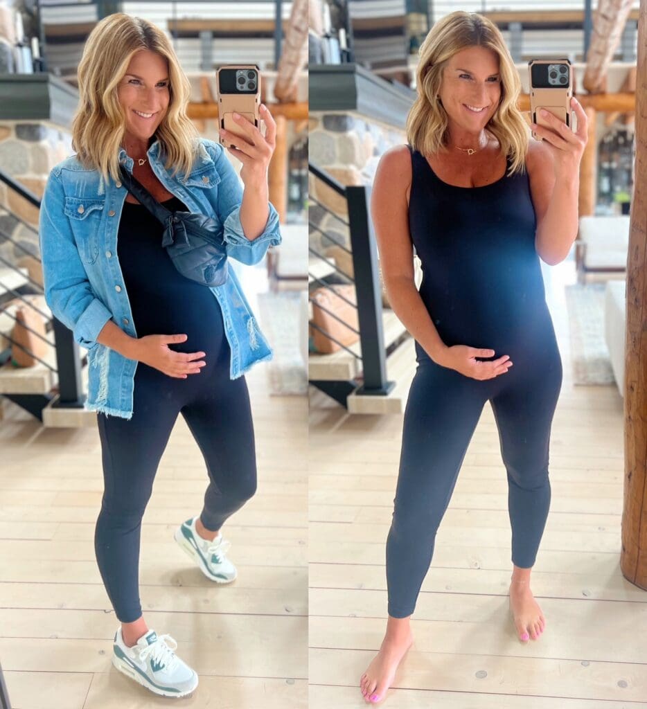 Maternity Jumpsuit [wearing in Medium for pregnancy] // Denim shirt jacket [true to size, wearing in small] // Sneakers [true to size] // Belt Bag