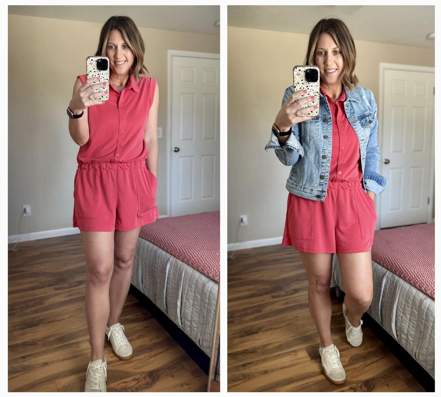 Romper [true to size] // Sneakers [true to size] // Denim Jacket [true to size]