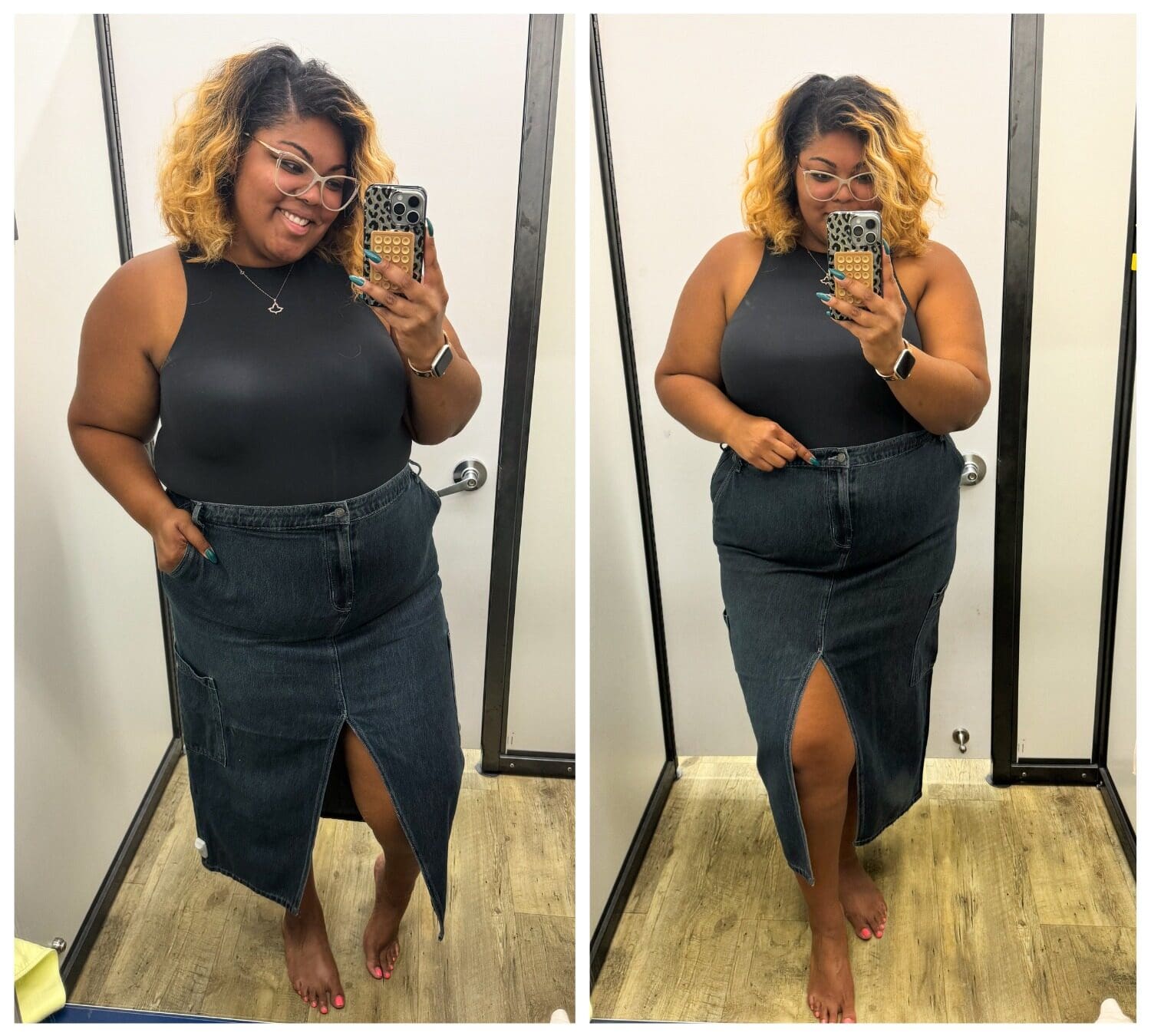 Old Navy has been having the cutest items lately, and I can’t stay out of their stores! This denim skirt is a MUST HAVE for me! It has such a relaxed fit, super flattering in my curvy and tall figure! While it comes in many colors, I love this dark/black color!
