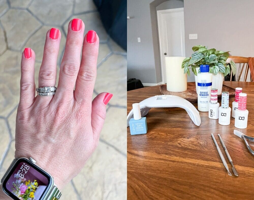 Gel Curing Lamp [obviously for curing the gel polish layers] // Remover [This breaks down the polish layers and then I gently scrape it off with the scraper I got in the tool kit] // Cuticle Cream [I’ve never been good at the cuticles, but this one has almost 50K reviews and works just like it says!] // Tool Kit [includes a cuticle pusher, a scraper, and a tool with a little narrow hook on the end that I wrap in a little cotton and use to clean up the edges before curing] // DND Polish [this links to all of the ones available on Amazon] // Chili Pepper [a really great red for anyone!] // Guava [similar to OPI Cajun Shrimp – what I’m wearing here!] // Top/Base Coat