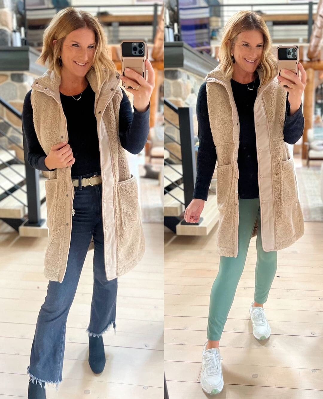 Vest [size up if in between, wearing small] // Similar Jeans // Boots [true to size] // “Save” Uggs [size up if in between] // Leggings [size down if in between]