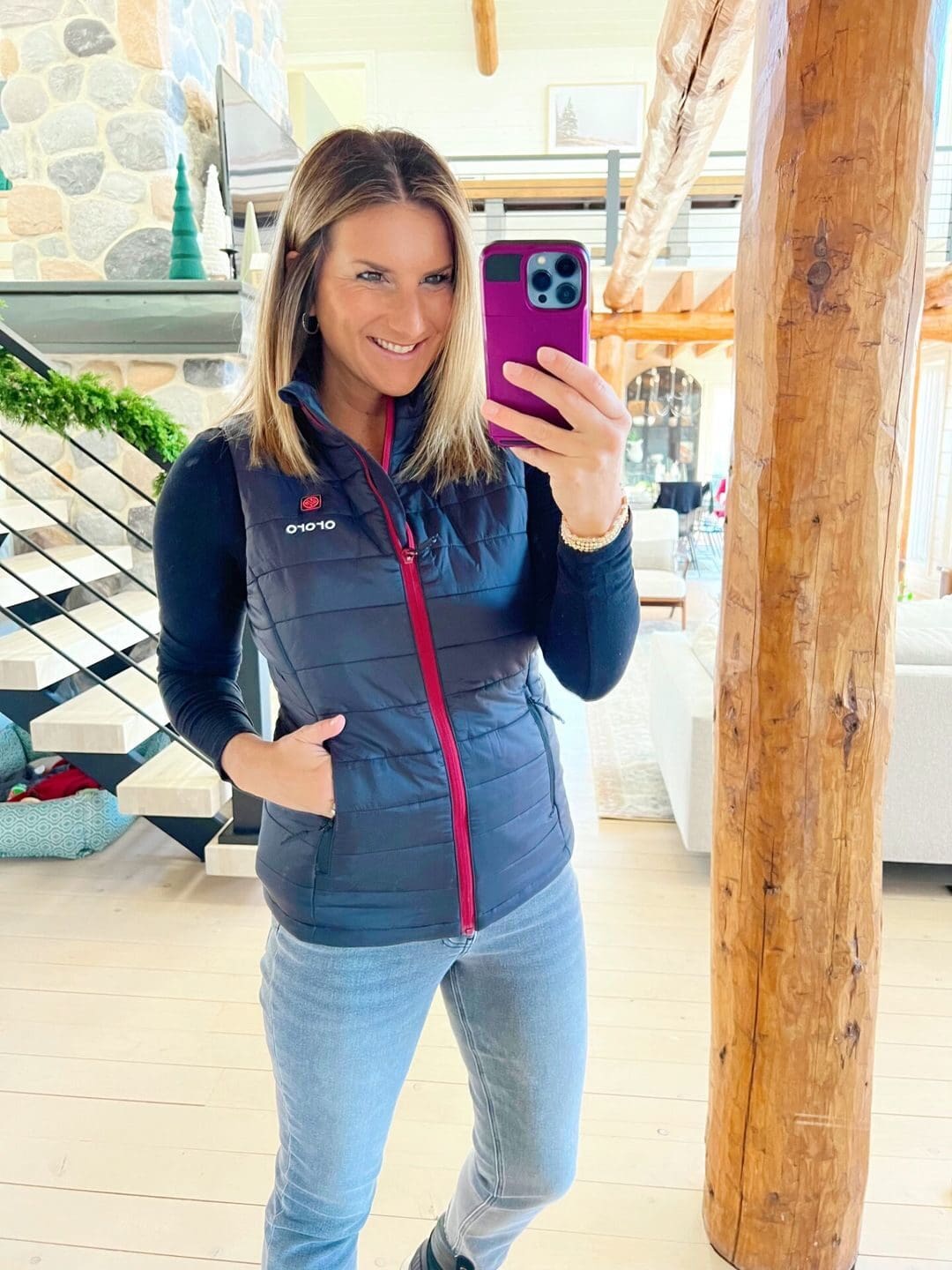 Ambassador Heather here with my new go-to vest from Evereve. I love the look, fit and color of this vest. It’s a great color for fall! I often get too warm in vests so I was on the hunt for something more light weight and this is a great option. I also like that it zips & snaps! I got a small and would suggest to go with your true size. Here I’m wearing a sweater under the vest and it’s a comfortable fit!