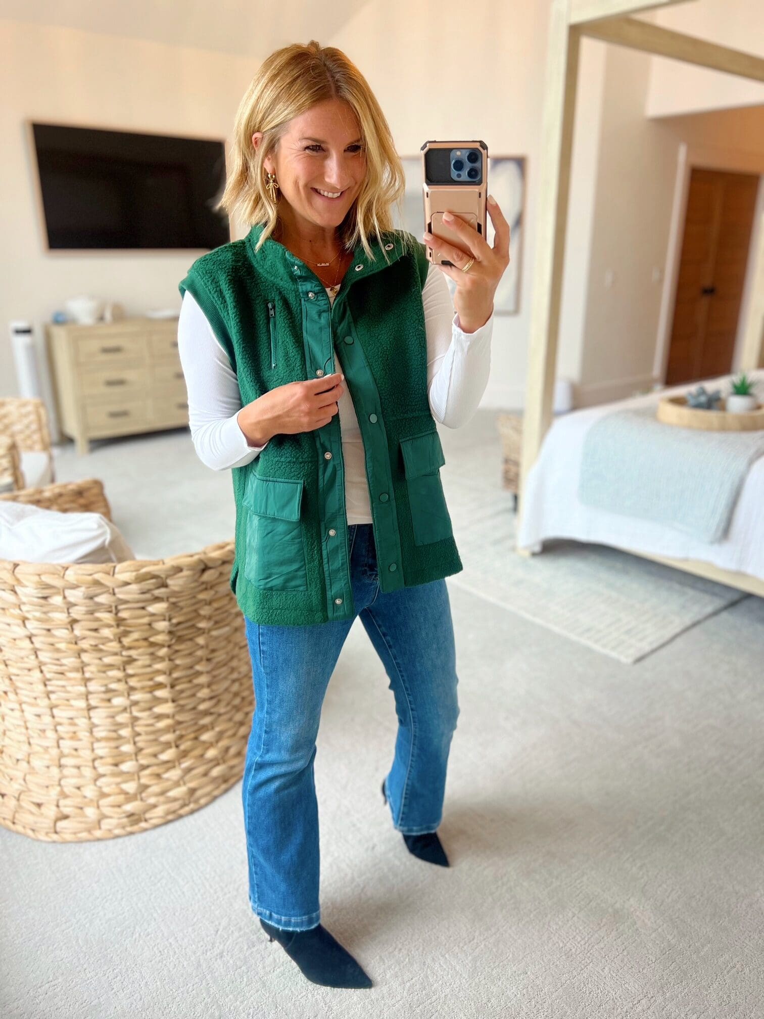 Vest [true to size, wearing small, dark green] // Long sleeve tee [size up if in between, wearing in medium] // Jeans [true to size, wearing in 5/27 – if in between, go up] // Booties [true to size]