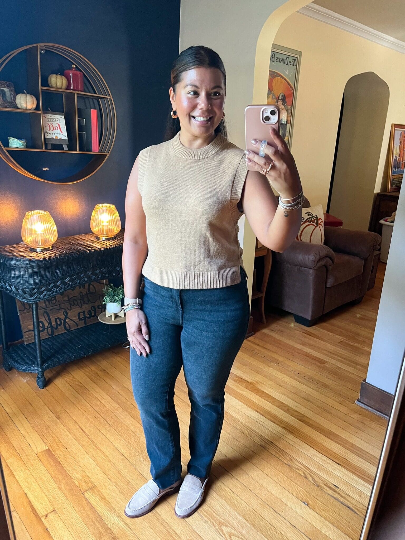 Quilted Puffer Vest [true to size, wearing in large for extra layering room but could also wear in medium] / Light Weight Cable Long Sleeve [true to size, wearing in large for a looser fit but could also wear medium] / Jeans [true to size, wearing in 10R] / Bow Loafers [true to size]