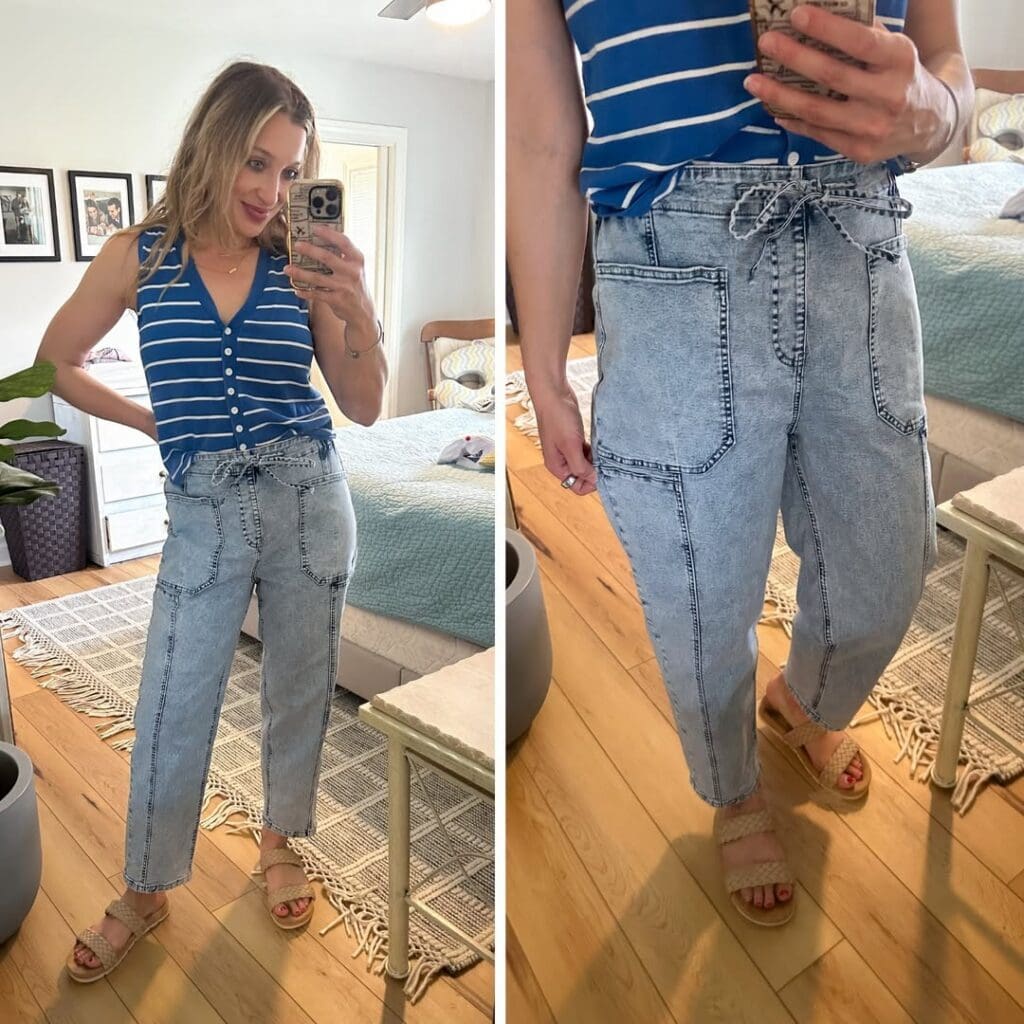 Summertime is here and let’s be honest when it comes to bottoms: if it doesn’t stretch, we’re not interested. 🤣 At this point in our lives [and in our closets], comfort is key and thankfully, denim and pants have finally caught up. The classic look of jeans, now with the all-day wearability of your favorite joggers! Whether you’re chasing kids, running errands, hopping on a meeting, or just lounging with an iced latte in hand, these button free pants are here to make getting dressed feel like a little more exciting! Let’s dive into the styles we’re loving, how to wear them, and why they just might be your new everyday MVP… sharing all of our recent favorite bottoms that say bye bye to buttons below!