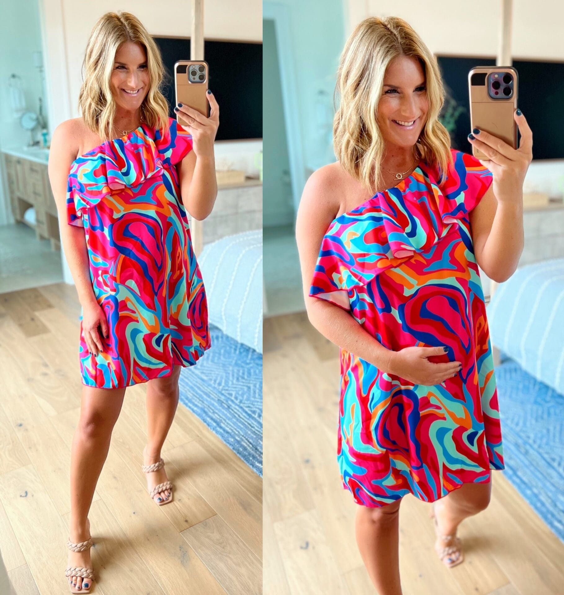Amazon One Shoulder Dress [true to size – wearing medium for bump, but would prefer in small] // Heels [true to size]