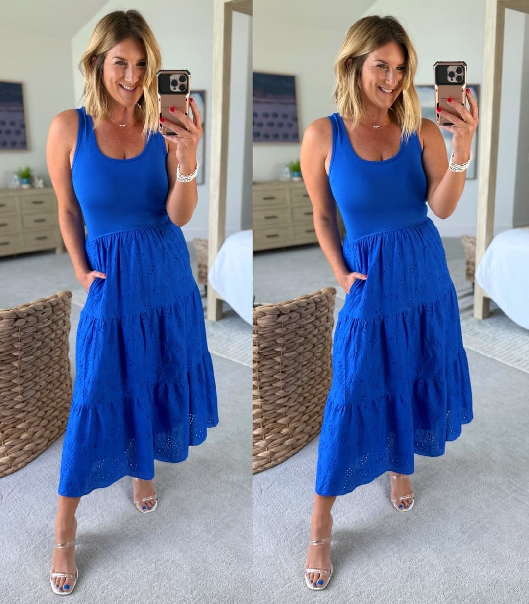 Dress [true to size, wearing in small in brilliant blue] // Heels [true to size] // Clutch