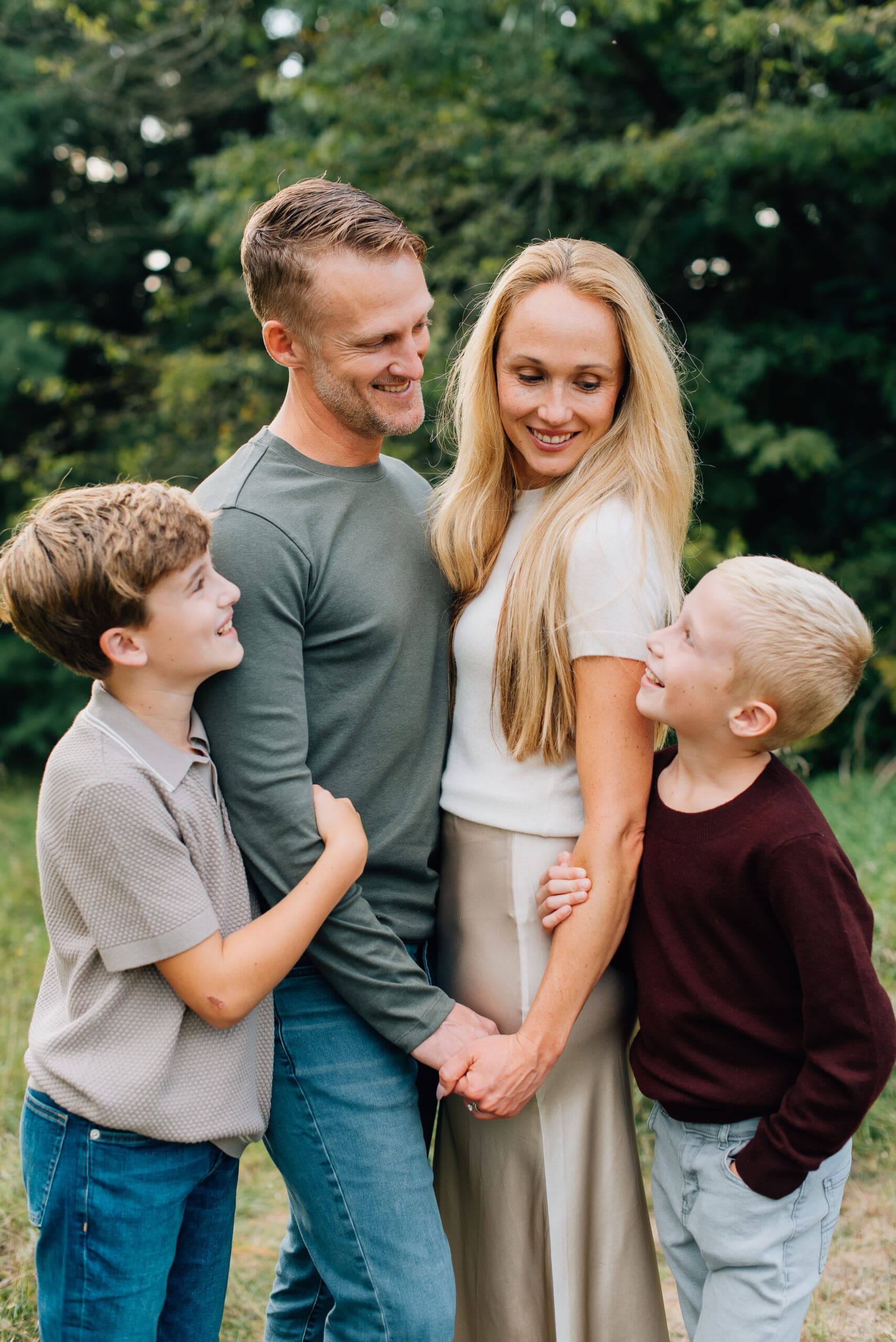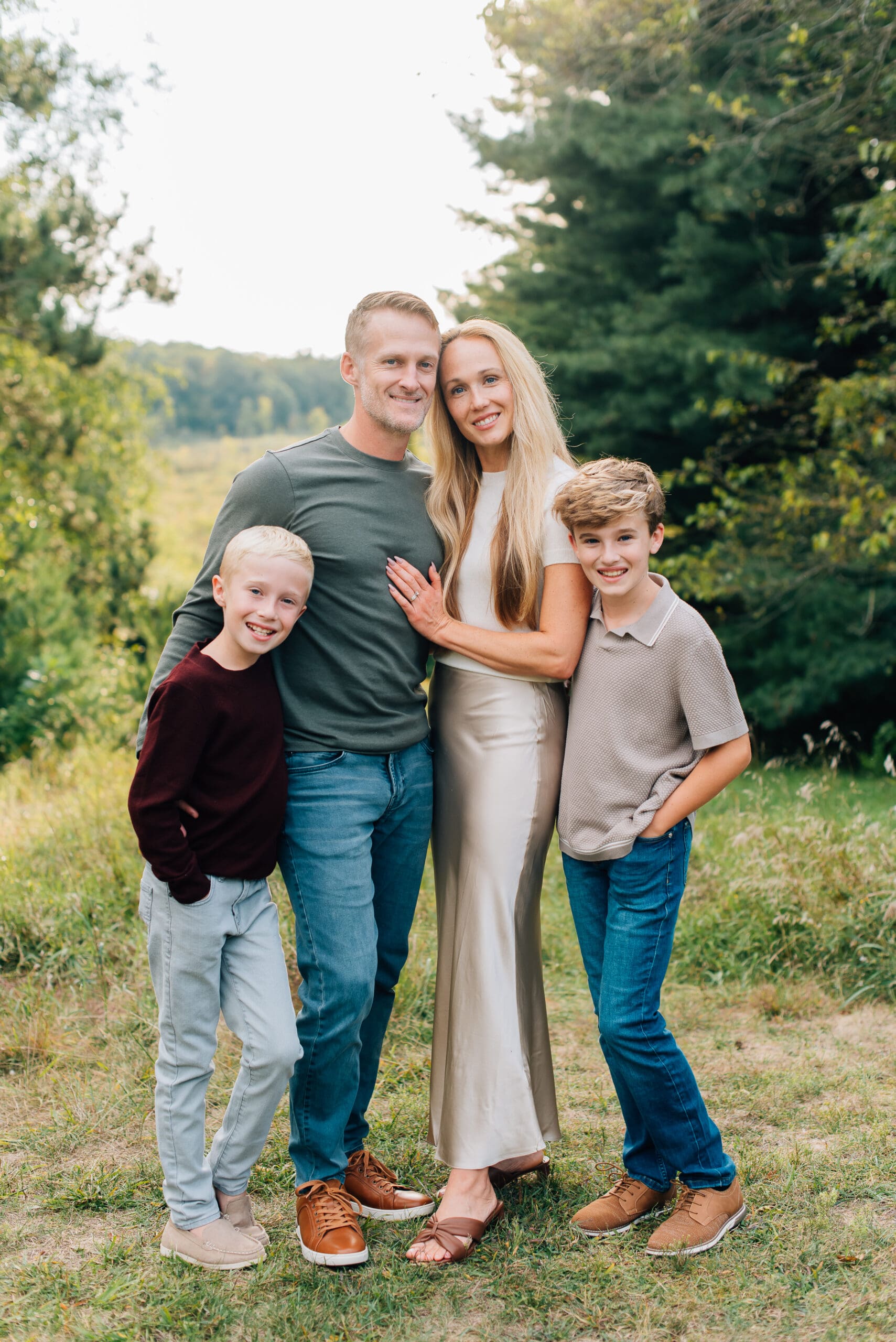 Devon’s Cashmere Tee [true to size, wearing XS in Ivory] // Devon’s Silk Skirt [true to size, wearing small in Champagne] // Devon’s Heels [true to size] // Craig’s Luxe Crew [true to size in Olive Green] // Craig’s Jeans [true to size, in Slate Blue] // Craig’s Shoes [true to size] // Greyson’s Sweater Polo [true to size in Flint] // Greyson’s Jeans [true to size] // Greyson’s Shoes // Griffin’s Sweater [true to size, in Burgundy] // Griffin’s Jeans [true to size] // Griffin’s Shoes