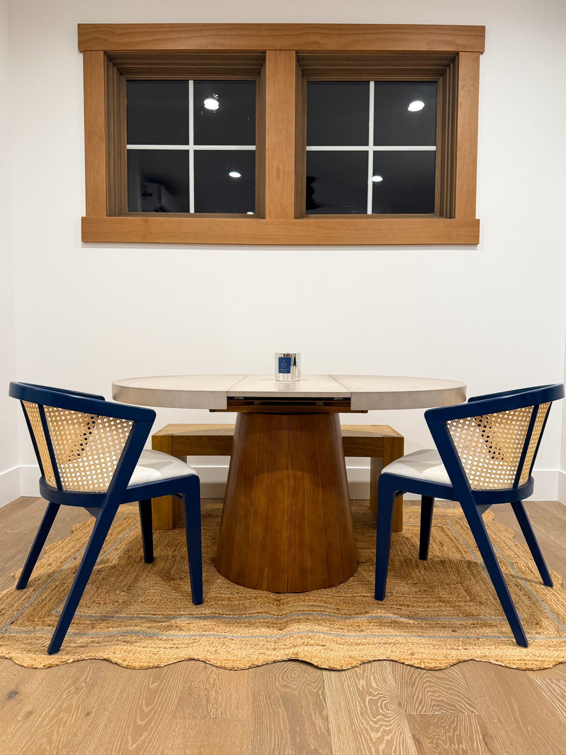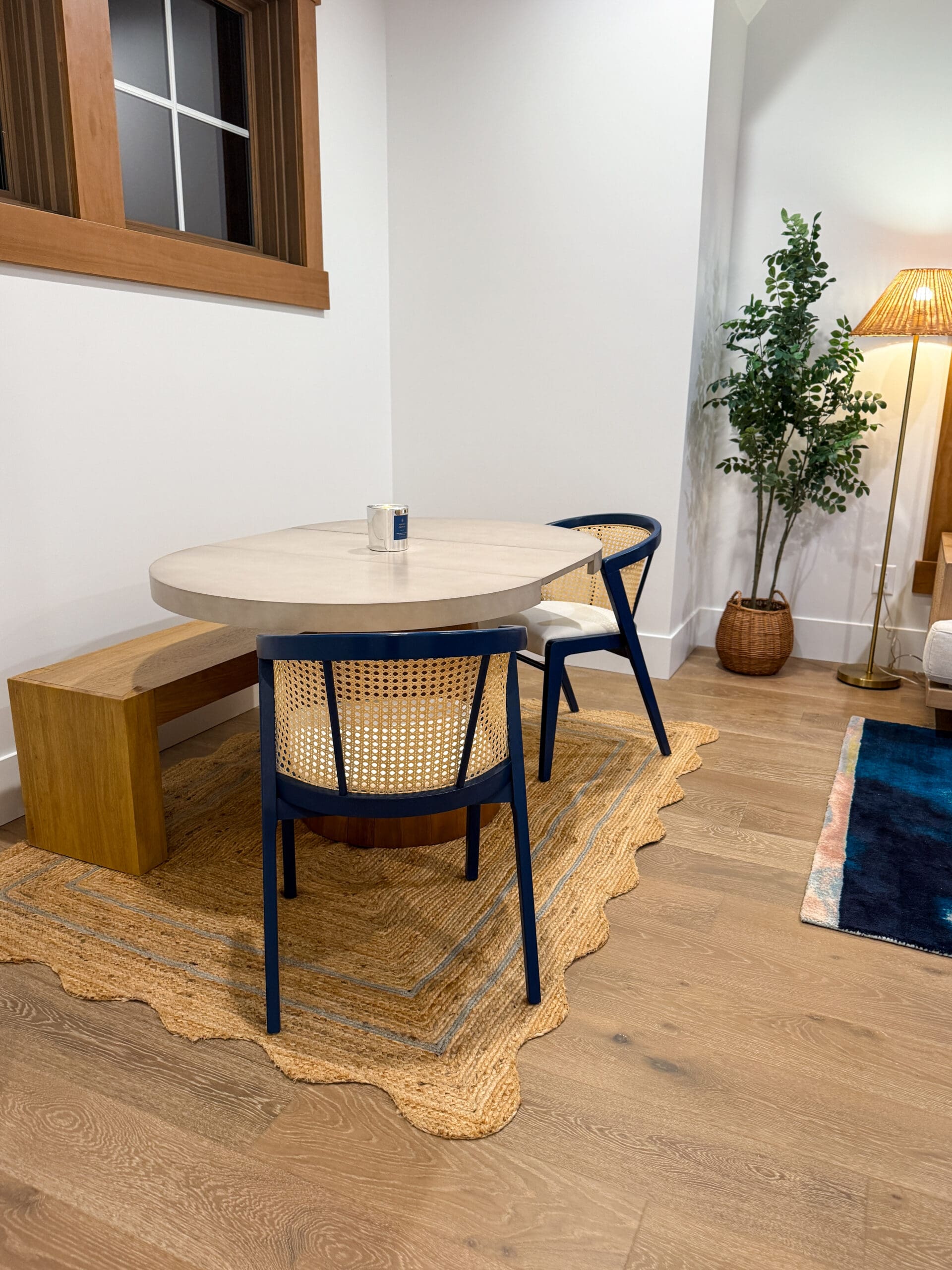Extendable Dining Table // Chairs // Scalloped Jute Rug // Candle // Wooden Bench