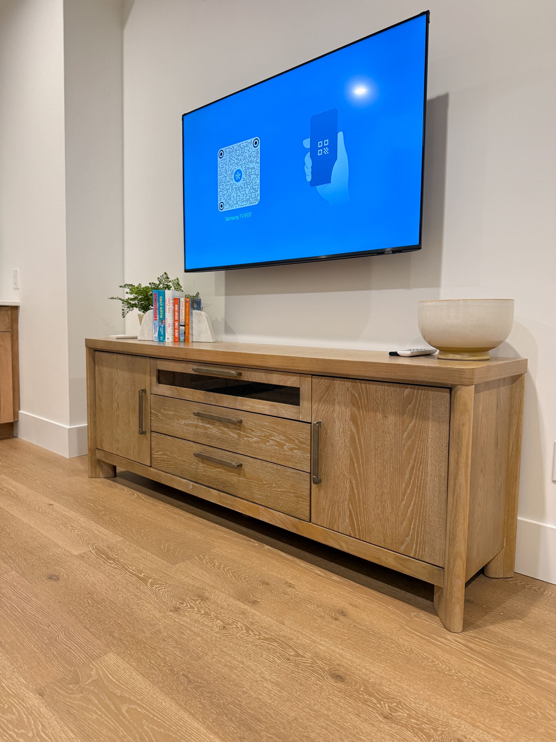 Rattan Coffee Table // Rug [5’x8′] // Couch // Entertainment Console // Book Ends