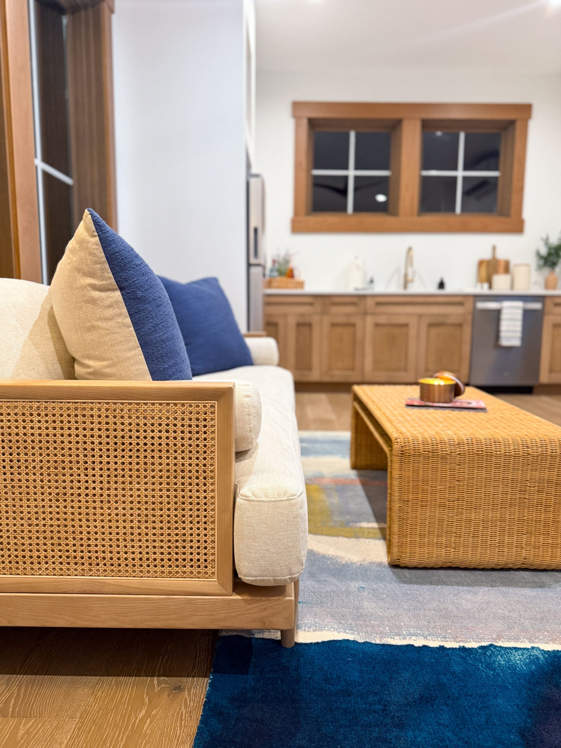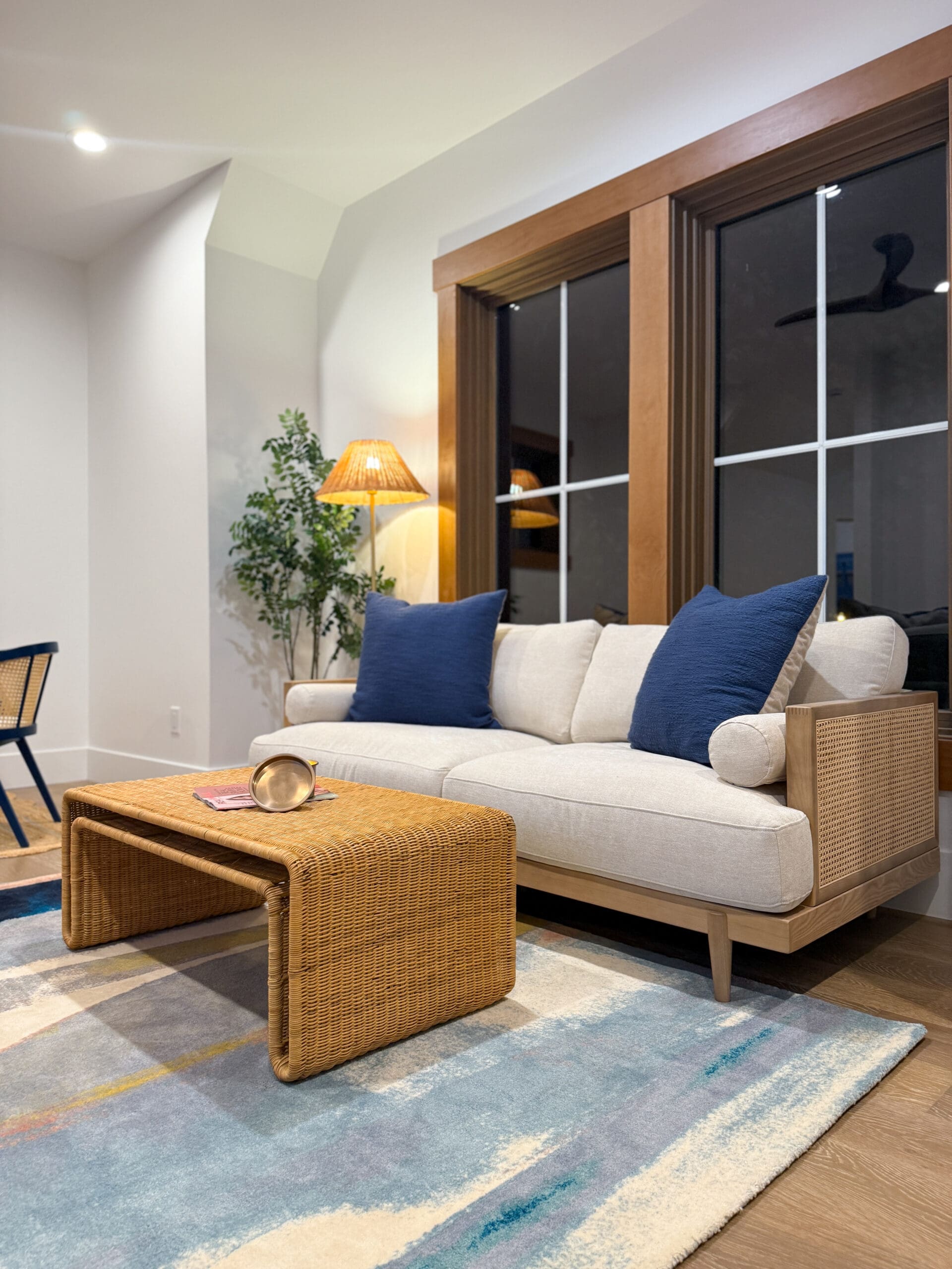 Couch // Pillows // Rattan Coffee Table // Rug [5’x8′] // Floor Lamp