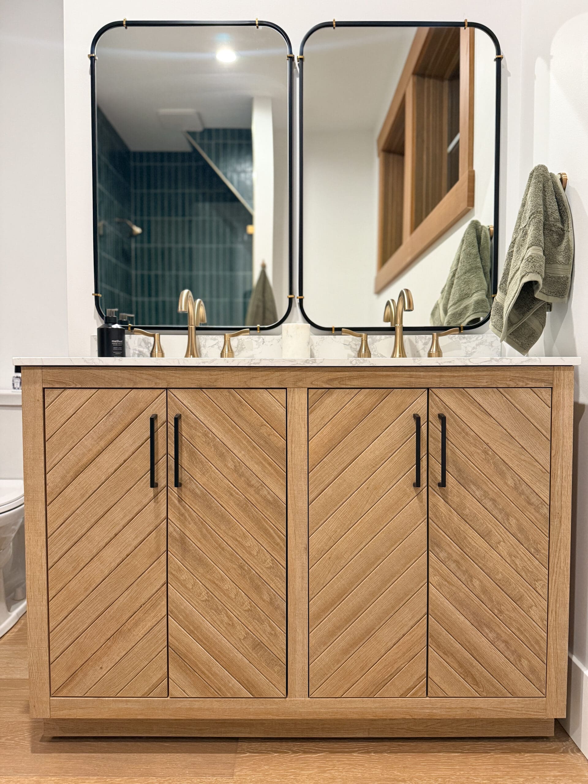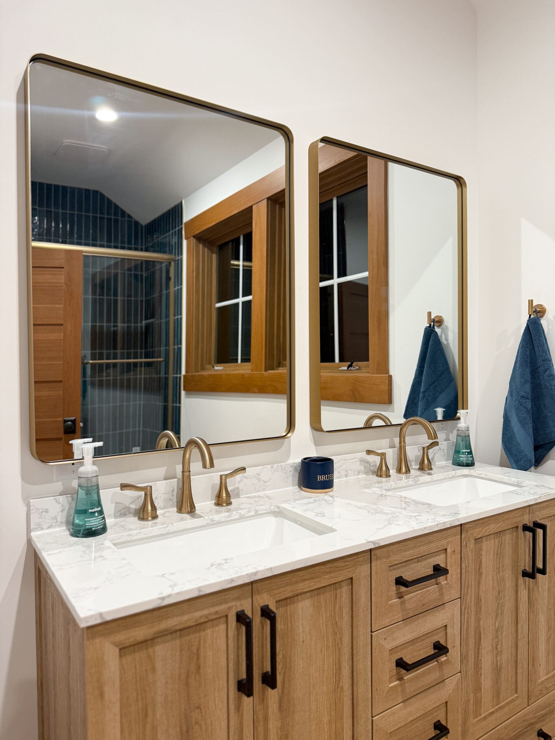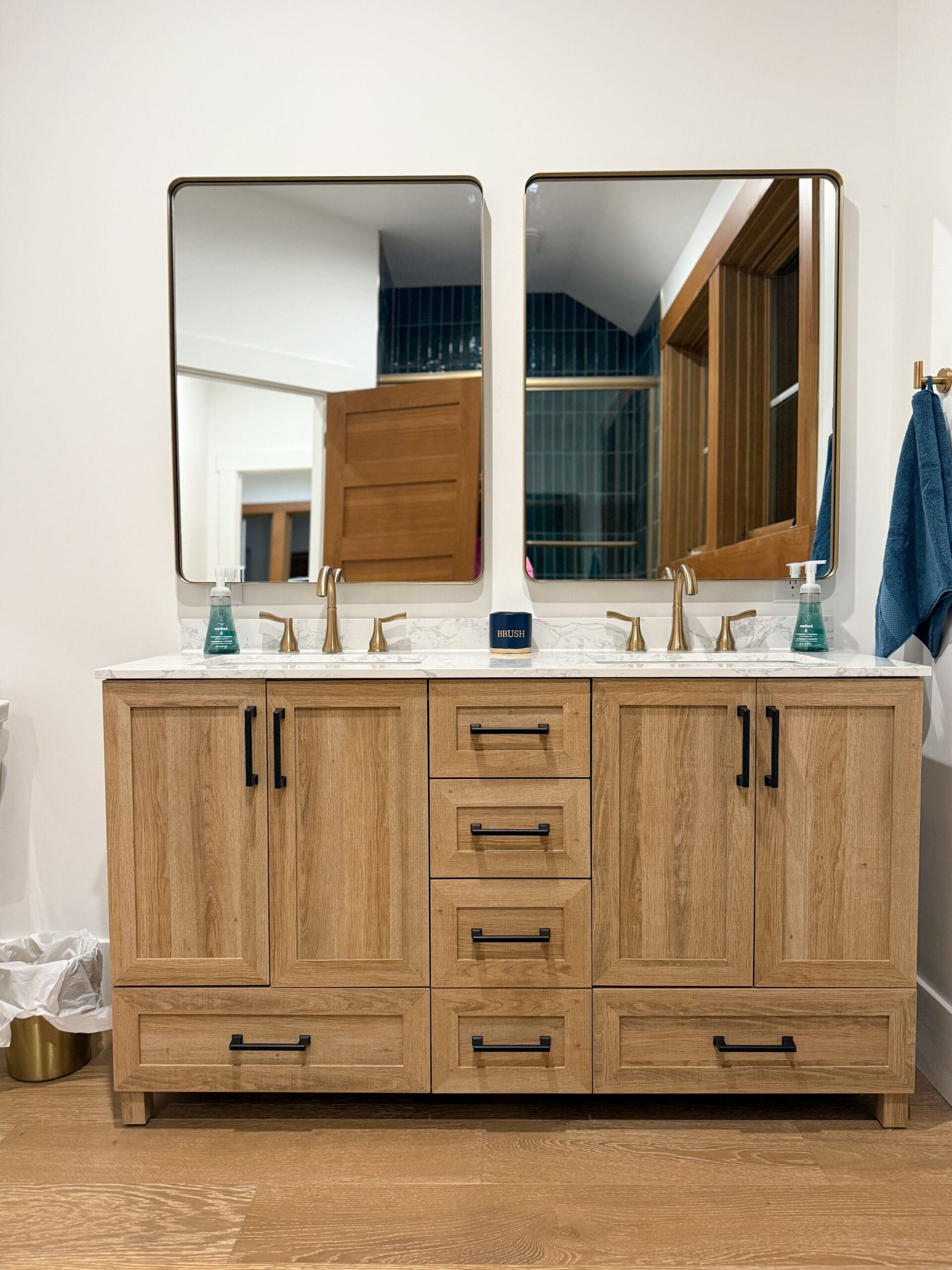 Double Sink Vanity with Marble Top // Pronged Mirrors
