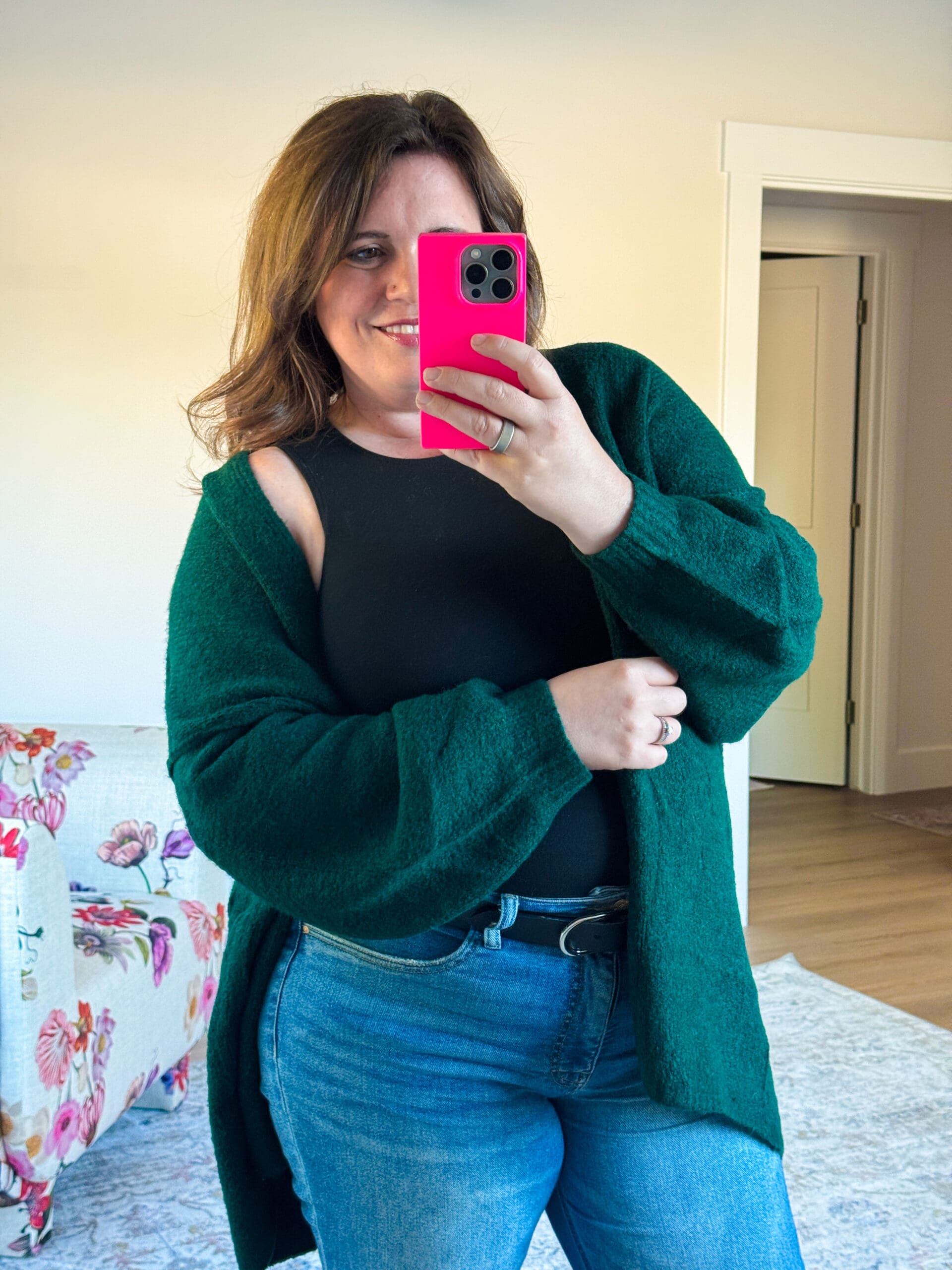 Cardigan [size down, oversized fit, wearing in M] // Body Suit [true to size, wearing in L] // Denim [true to size, wearing in 12]