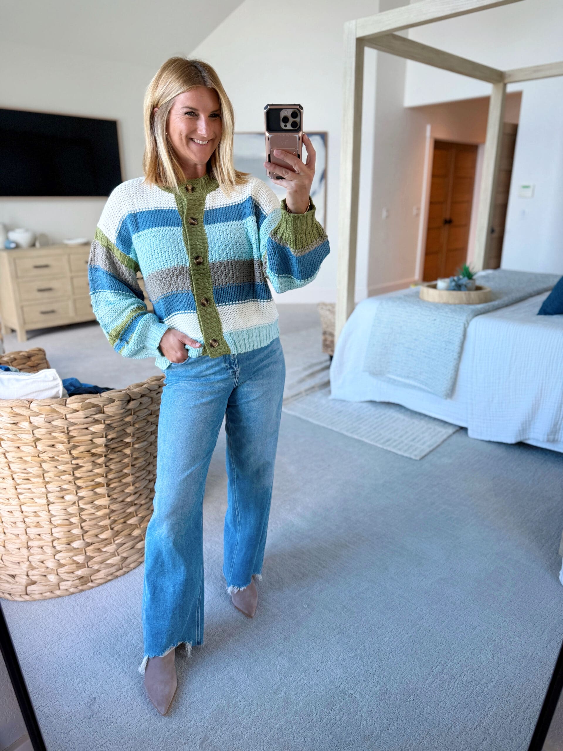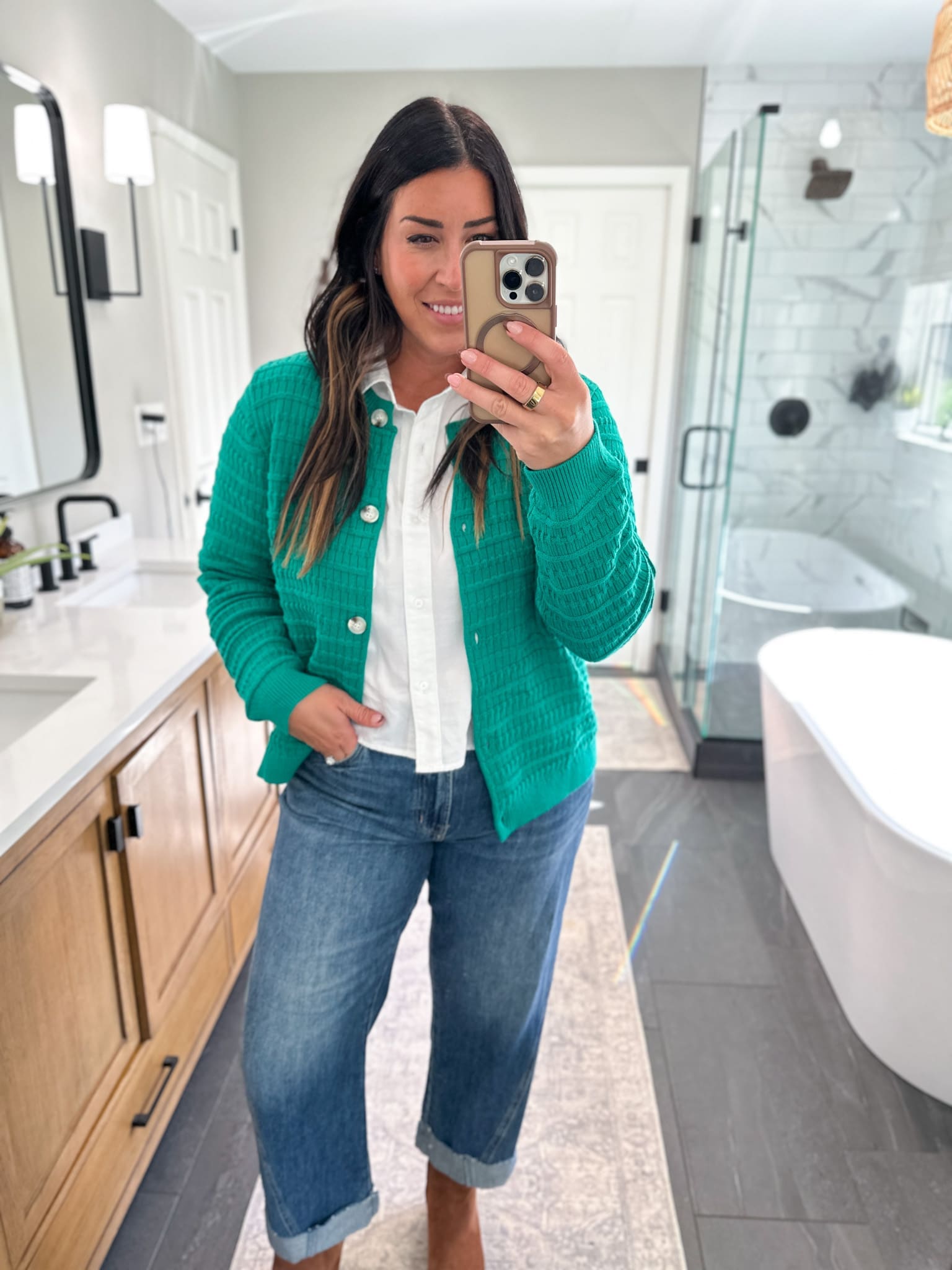 Cardigan [true to size, wearing in large in green] // Button Up [wearing in large, cropped] // Jeans [true to size]
