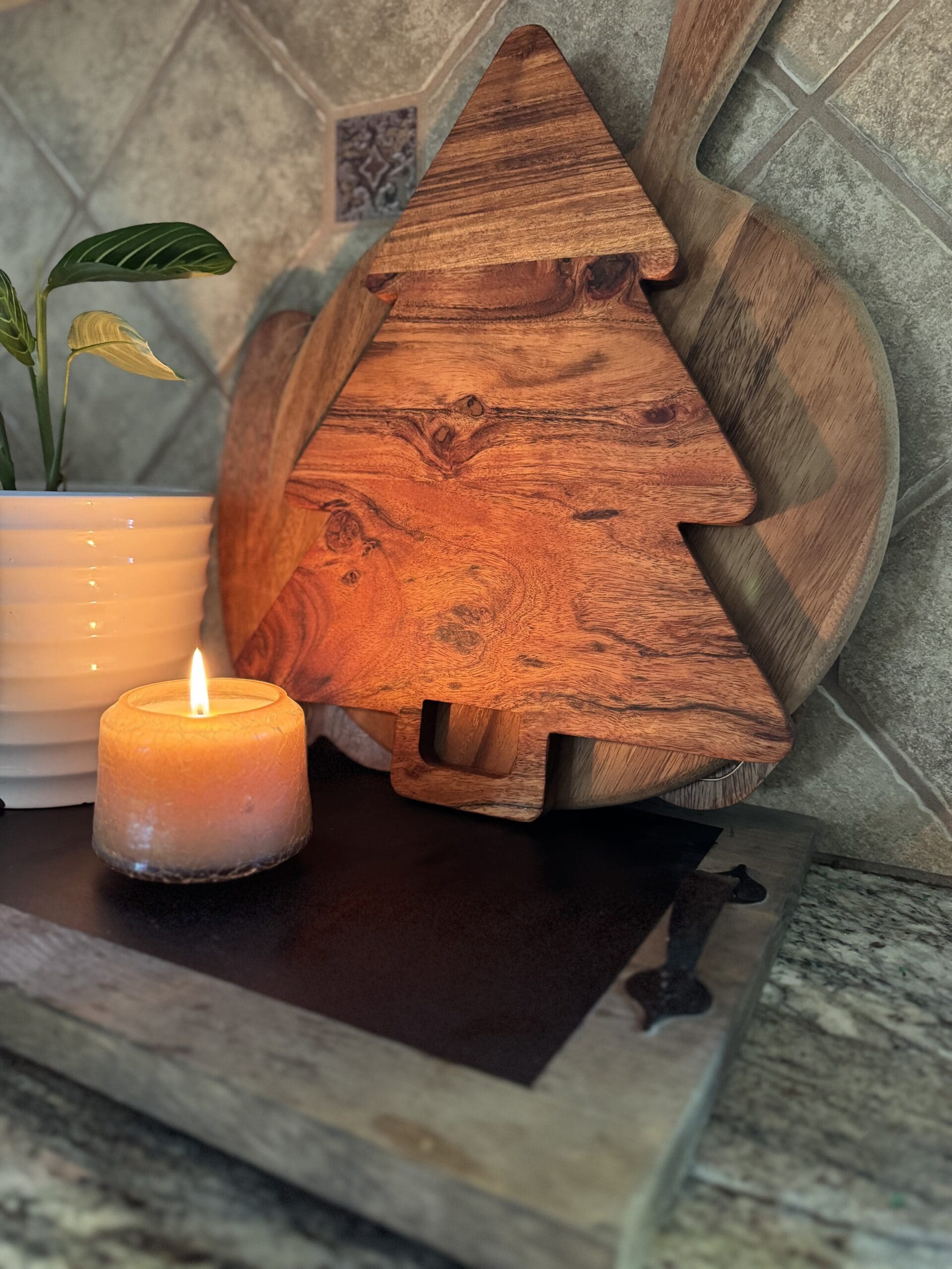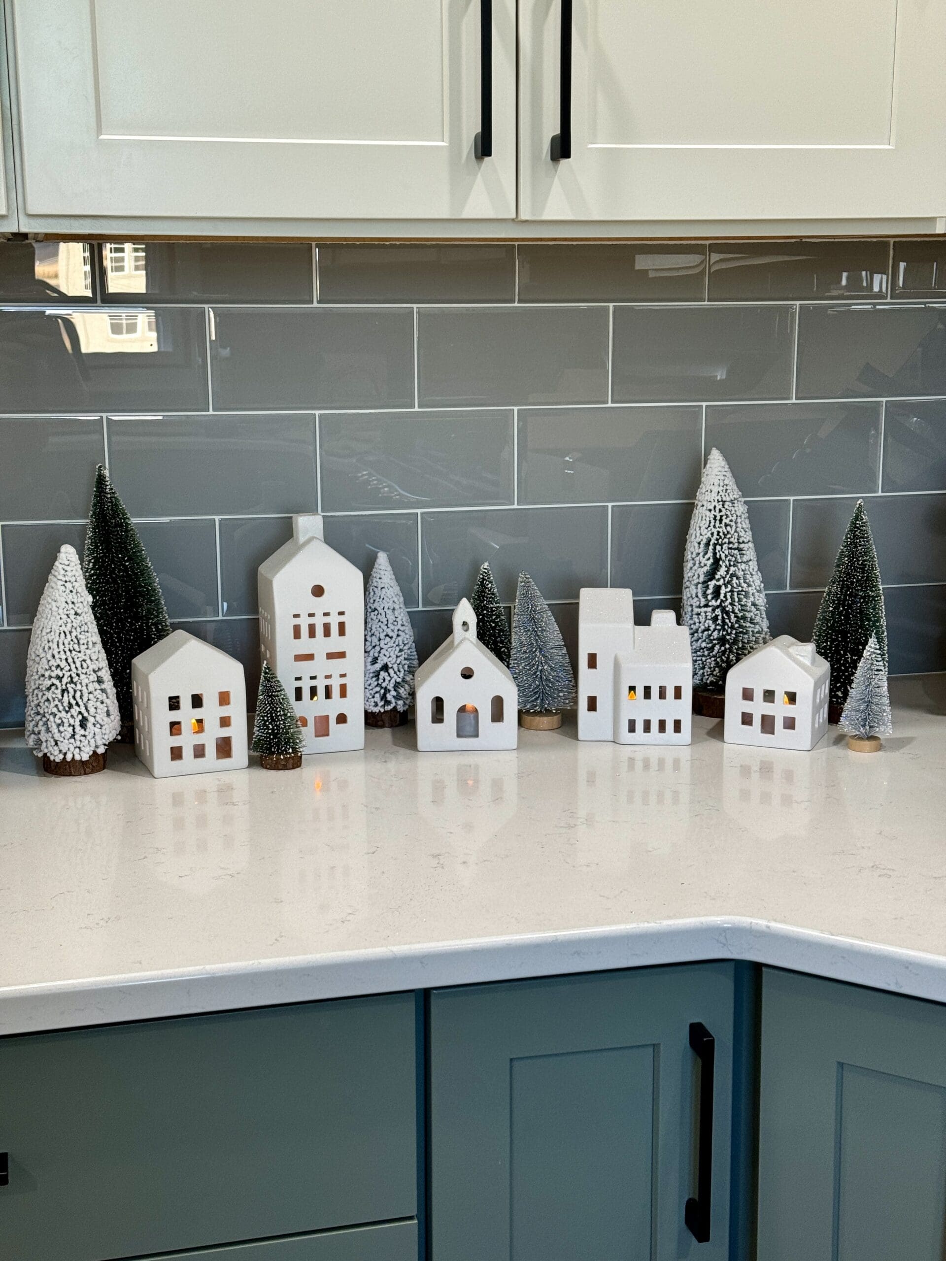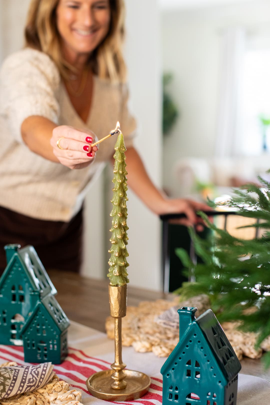 Tree Candles // Gold Candle Holders // Table Runner // Placemats // Greenery // Ceramic Houses