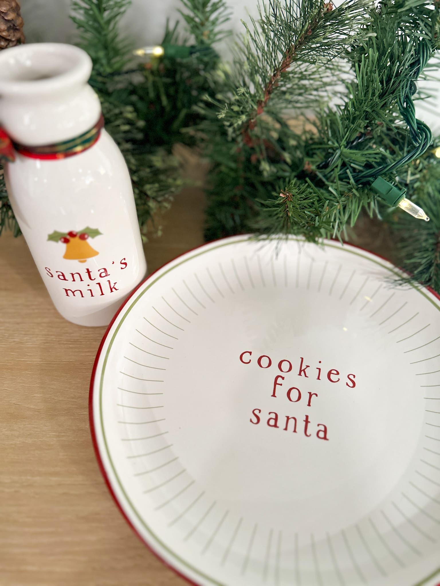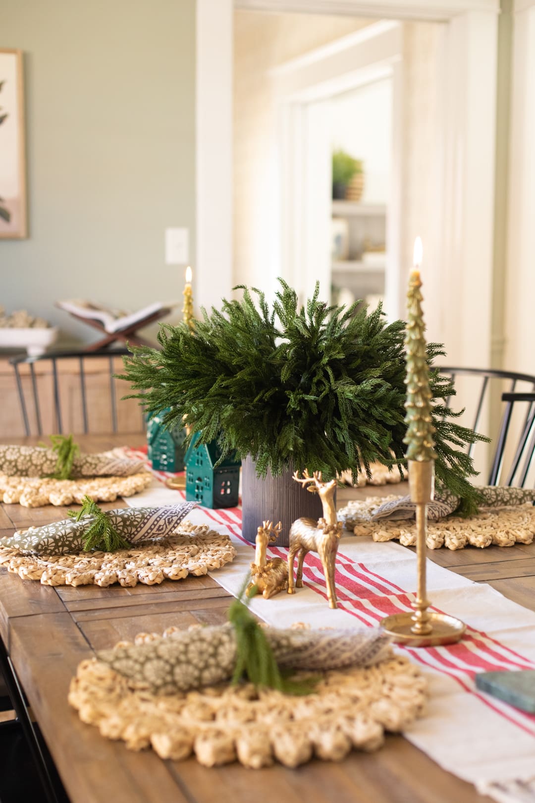 Tree Candles // Gold Candle Holders // Gold Deer // Table Runner // Placemats // Greenery // Vase // Napkins // Wreath Napkin Rings // Ceramic Houses