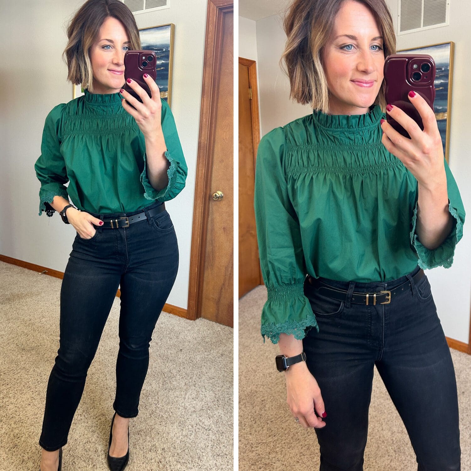 Smocked Top [size down, wearing in XS] // Jeans [size down if in between] // Heels [true to size]