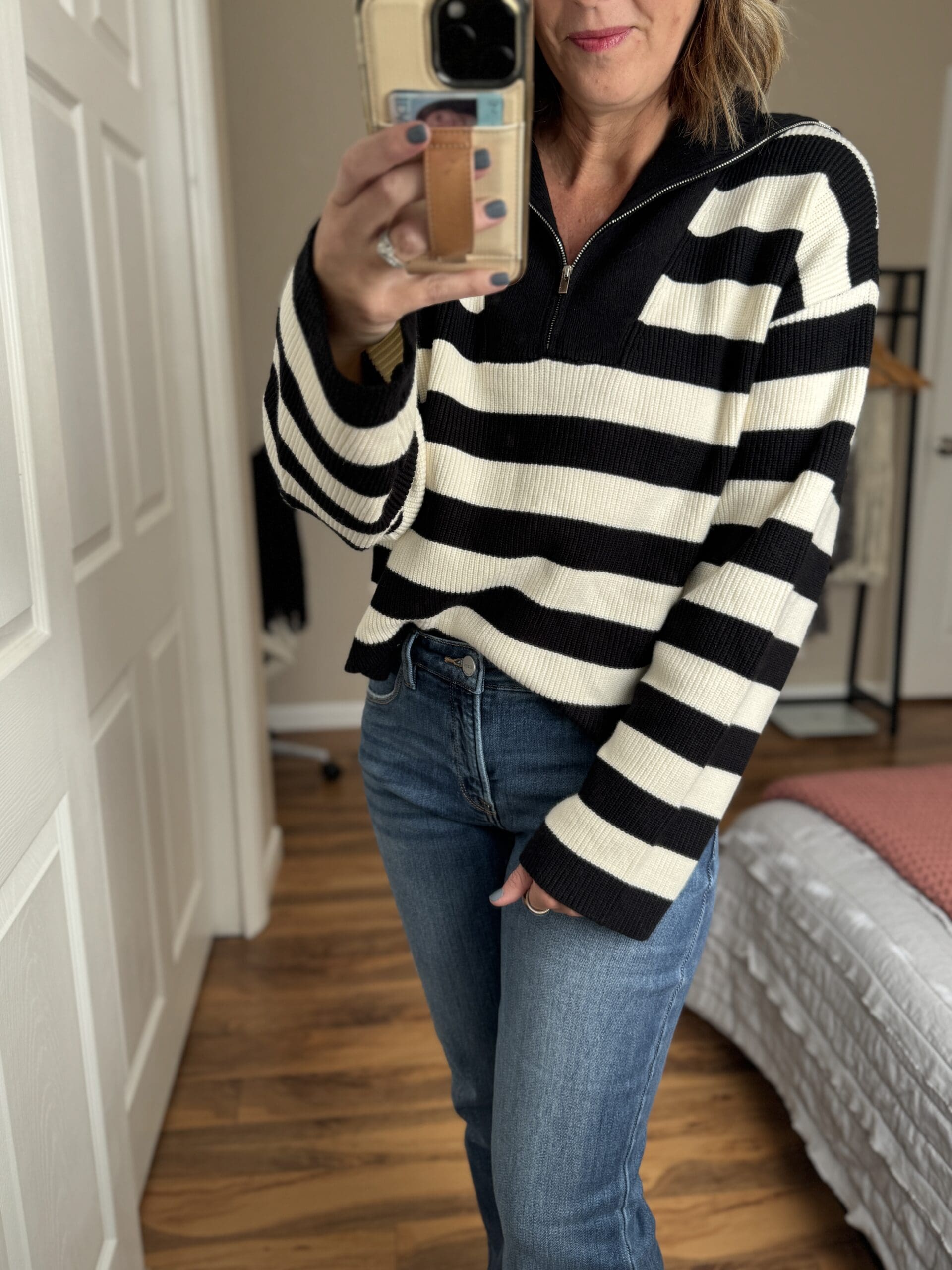 Sweater [true to size, wearing in Small] // Jeans [size down] // Booties [on sale! True to size]
