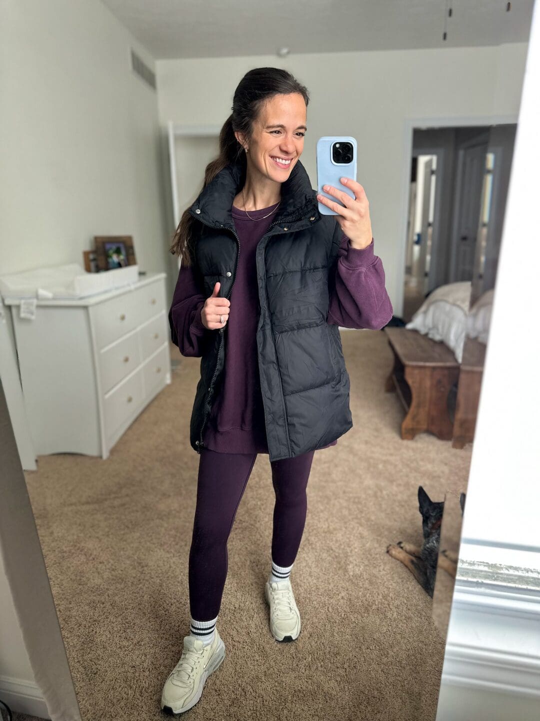 Vest [Size down, wearing in S in purple] // Long Sleeve Tee [true to size, wearing in M] // Leggings [true to size, wearing in M] // Sneakers [true to size]