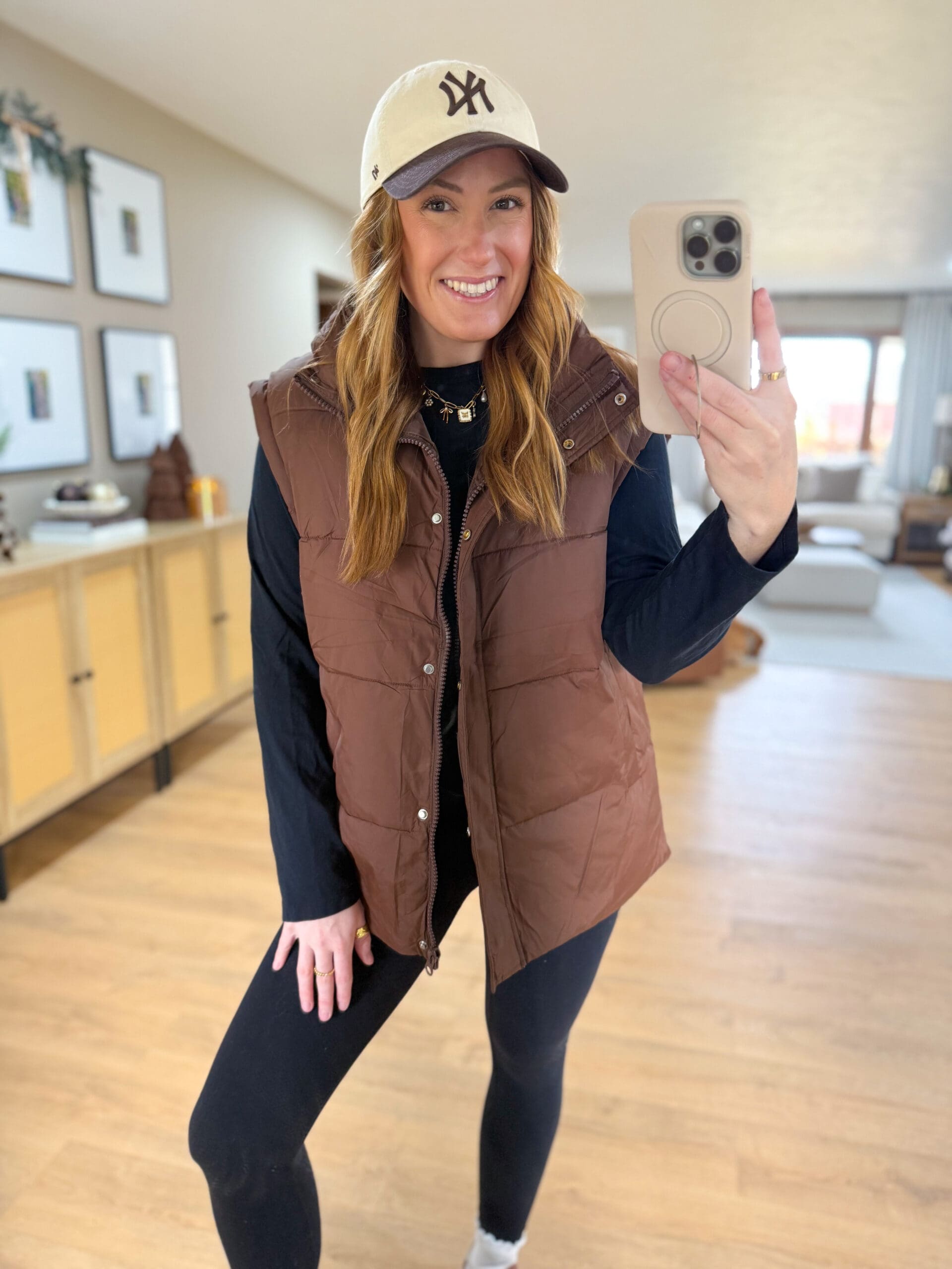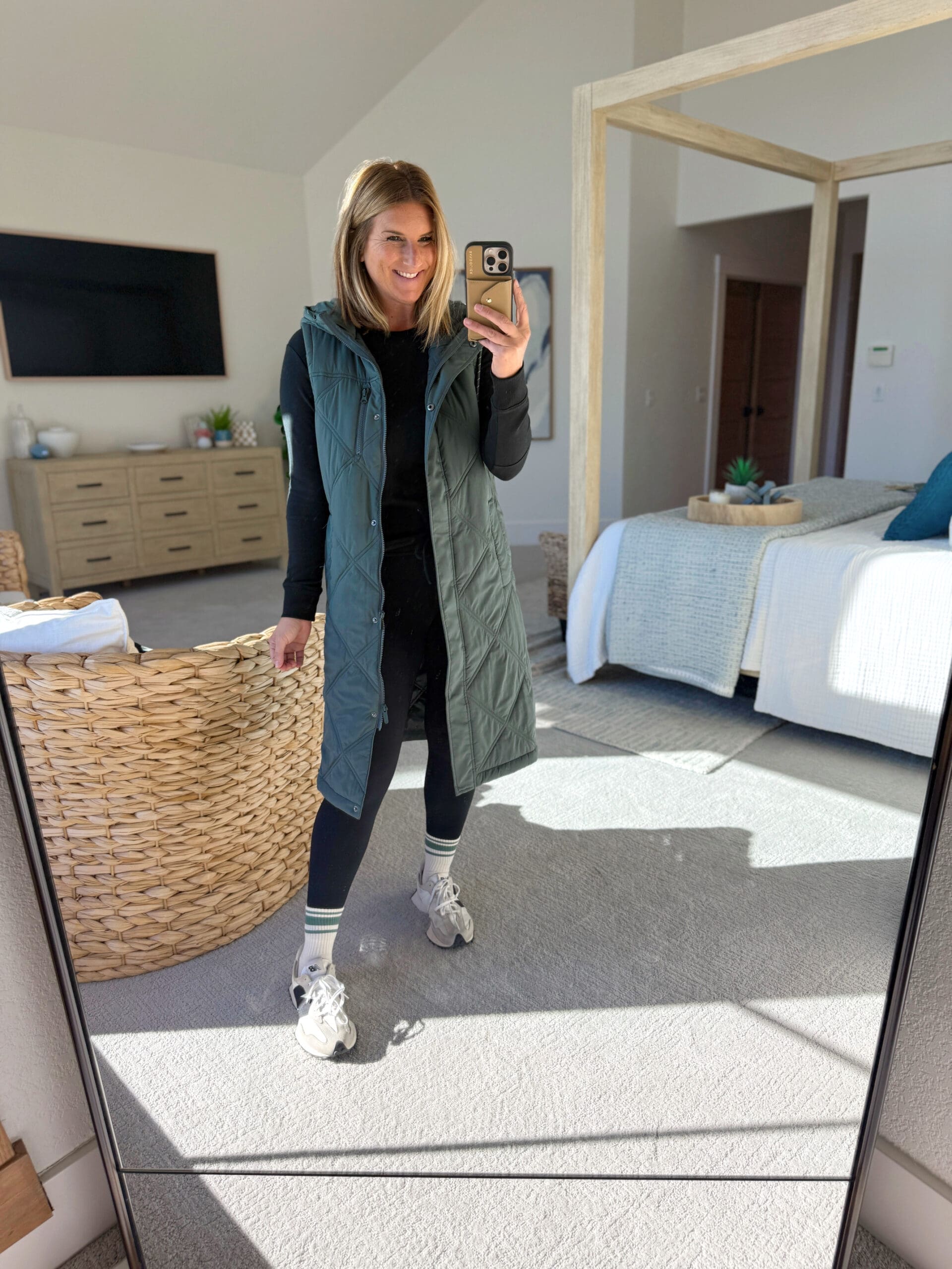 Long Hooded Puffer Vest [true to size] // Long Sleeve [true to size, wearing in Medium] // Leggings [true to size] // Sneakers [true to size]