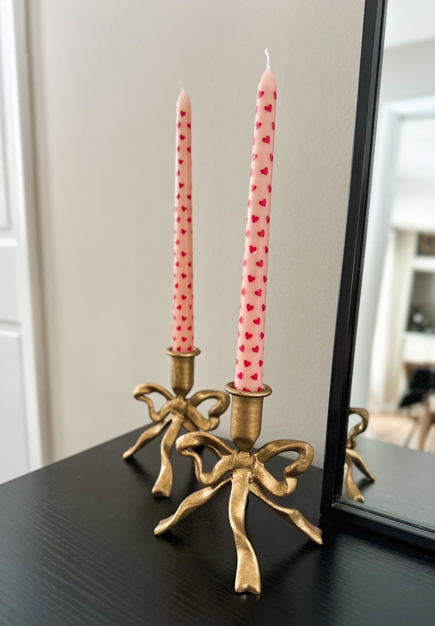 I didn’t think I was a person who decorated for Valentine’s Day until I saw these bow candle stick holders and heart candle sticks! I guess I now decorate for Vday!